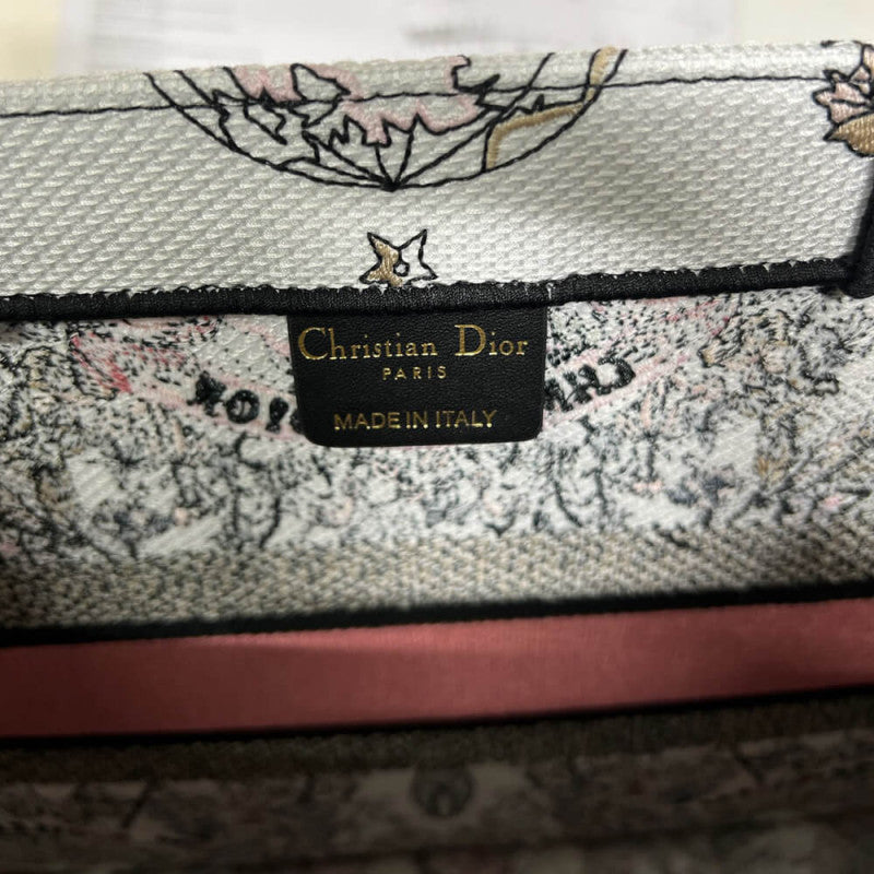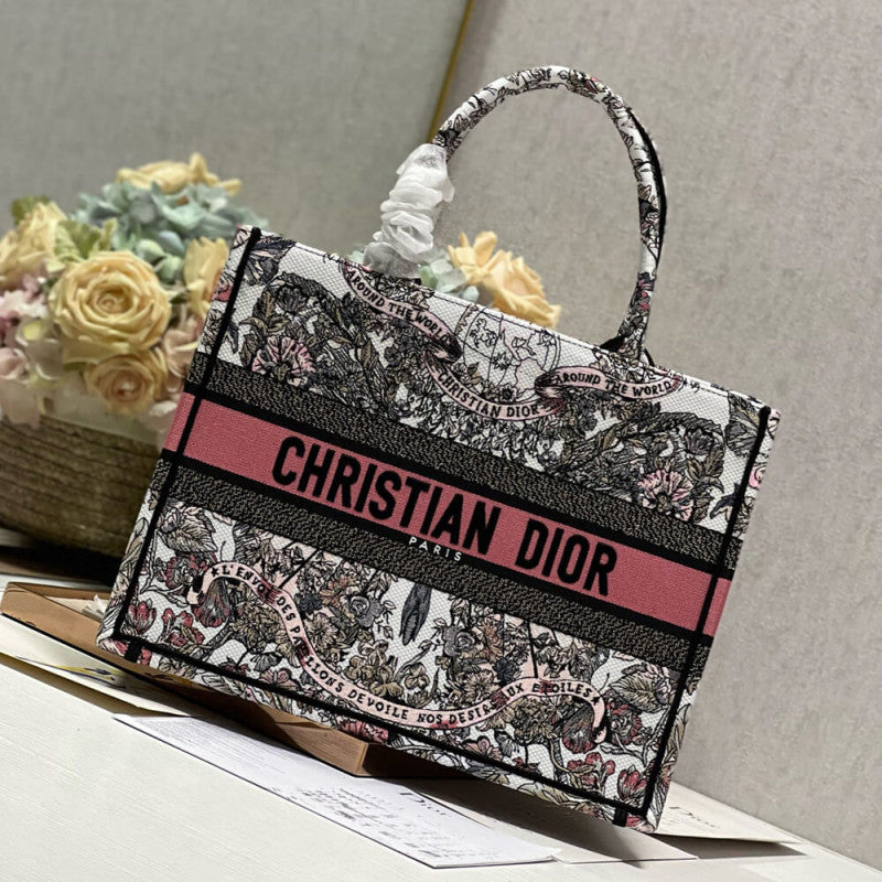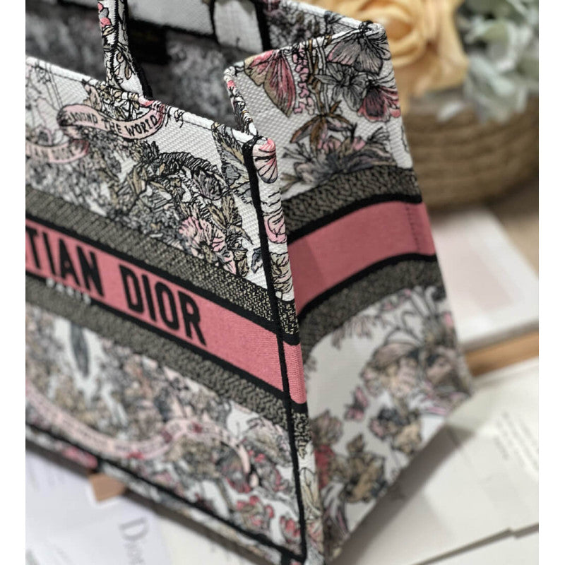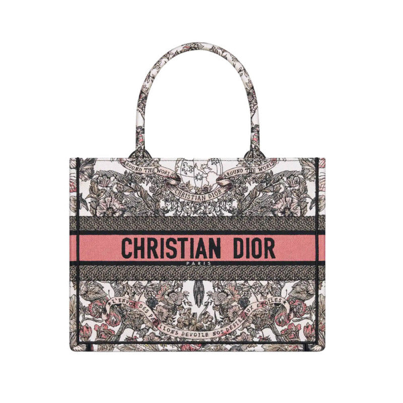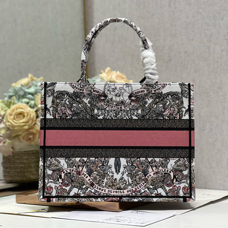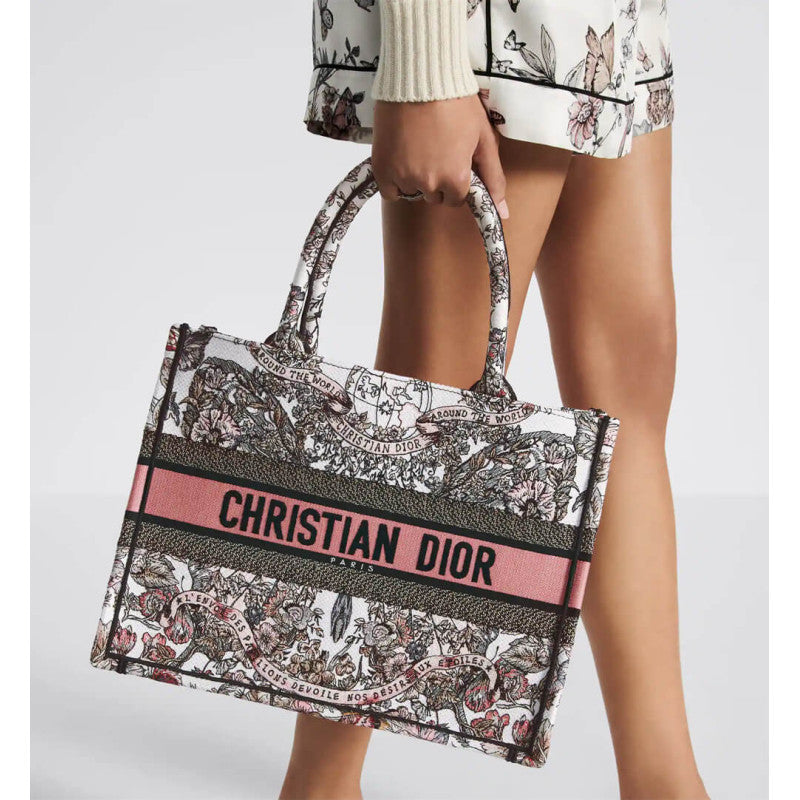 Introduced by Maria Grazia Chiuri, Creative Director of Christian , the Book Tote has become a staple of the aesthetic. Designed to hold all the daily essentials, it is fully embroidered with a Butterfly Around The World motif in white and pastel pink, showcasing the collection's signature butterfly embellished with the words L'envol des papillons d?¡ì|voile nos d?¡ì|sirs aux ?¡ì|toiles. Adorned with the Christian Paris signature on the front, the medium tote exemplifies the House's signature savoir-faire and may be carried by hand or worn over the shoulder.