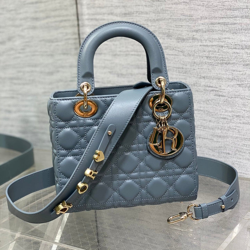 From the Lady dior 4-grid haze blue parchment gold buckle series, the latest spring/summer color exudes a fresh, light style. Paired with the newest lettered shoulder strap (6 letters included), it adds extra charm.