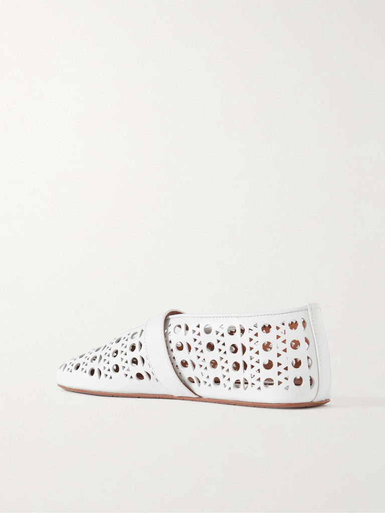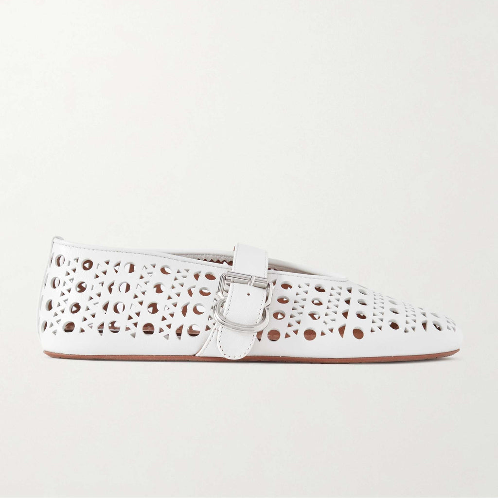leather ballet flats are perforated with the signature? motif and have a round toe and buckle-fastening front. Team yours with one of the house's cropped tops and tiered mini skirts.