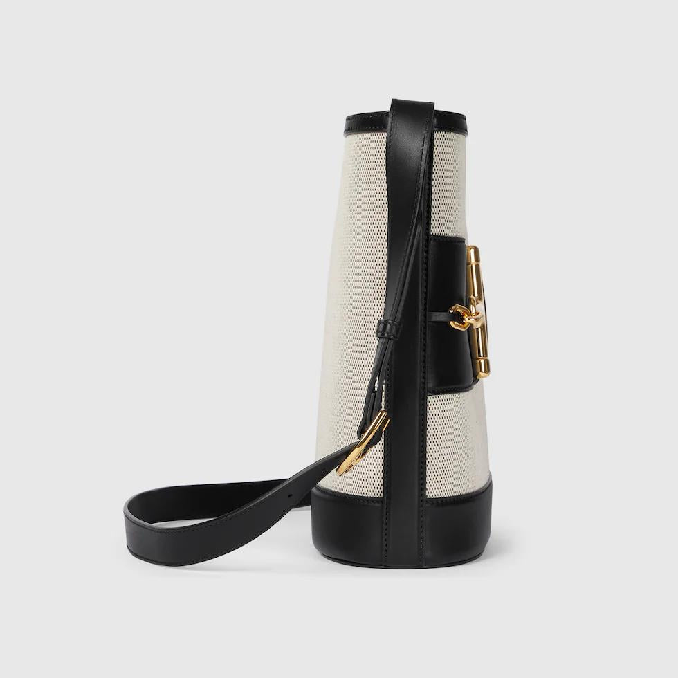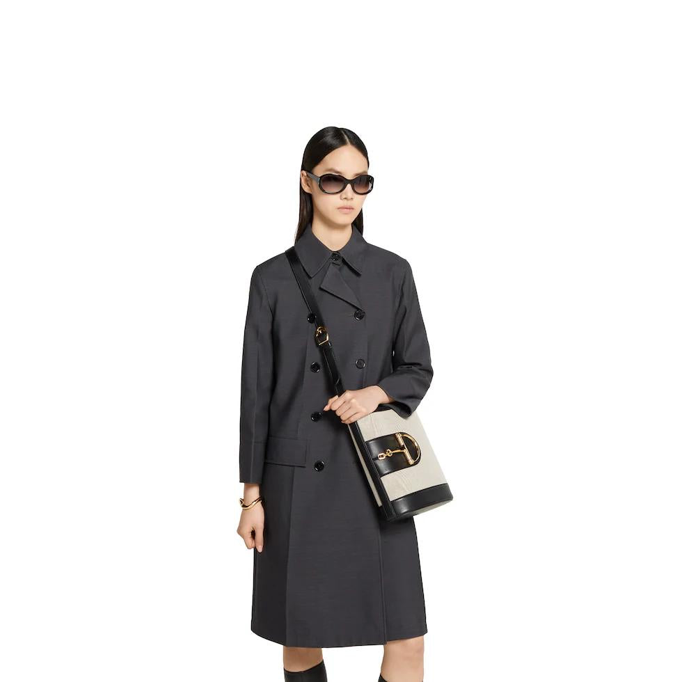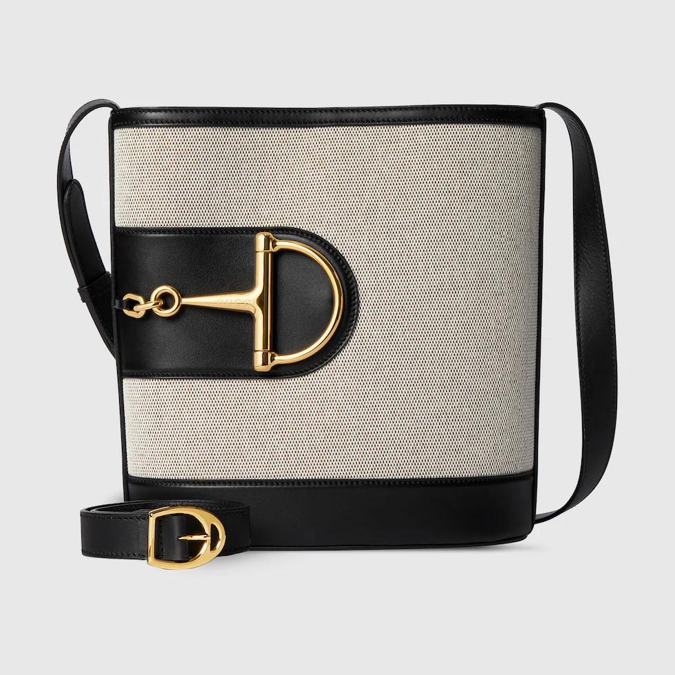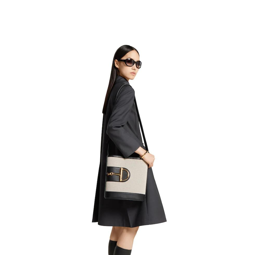 In the 2025 Spring/Summer collection, the GG 73 series takes inspiration from a classic bucket bag that was launched in the same year as the series name. This bag interprets the horsebit-shaped accessories with a modern aesthetic and can be worn crossbody, on the shoulder, or used as a handbag.White buckskinMaterial: Smooth leather, gold-toned bamboo joint hardware, brown cotton-linen blend lining. Inside: One zippered pocket.Dimensions: 26 x 27.5x 11.5 cm?