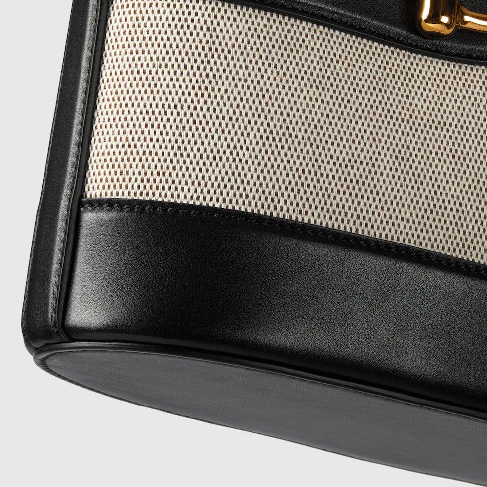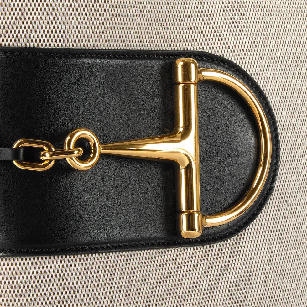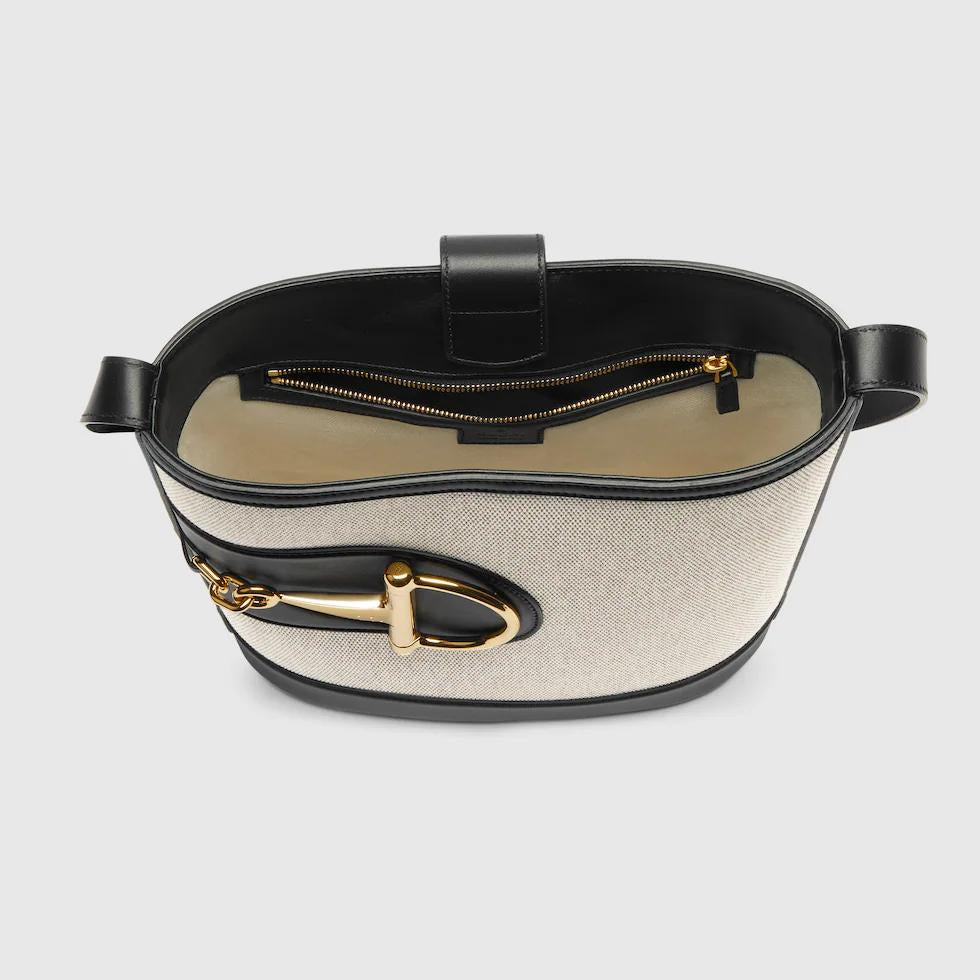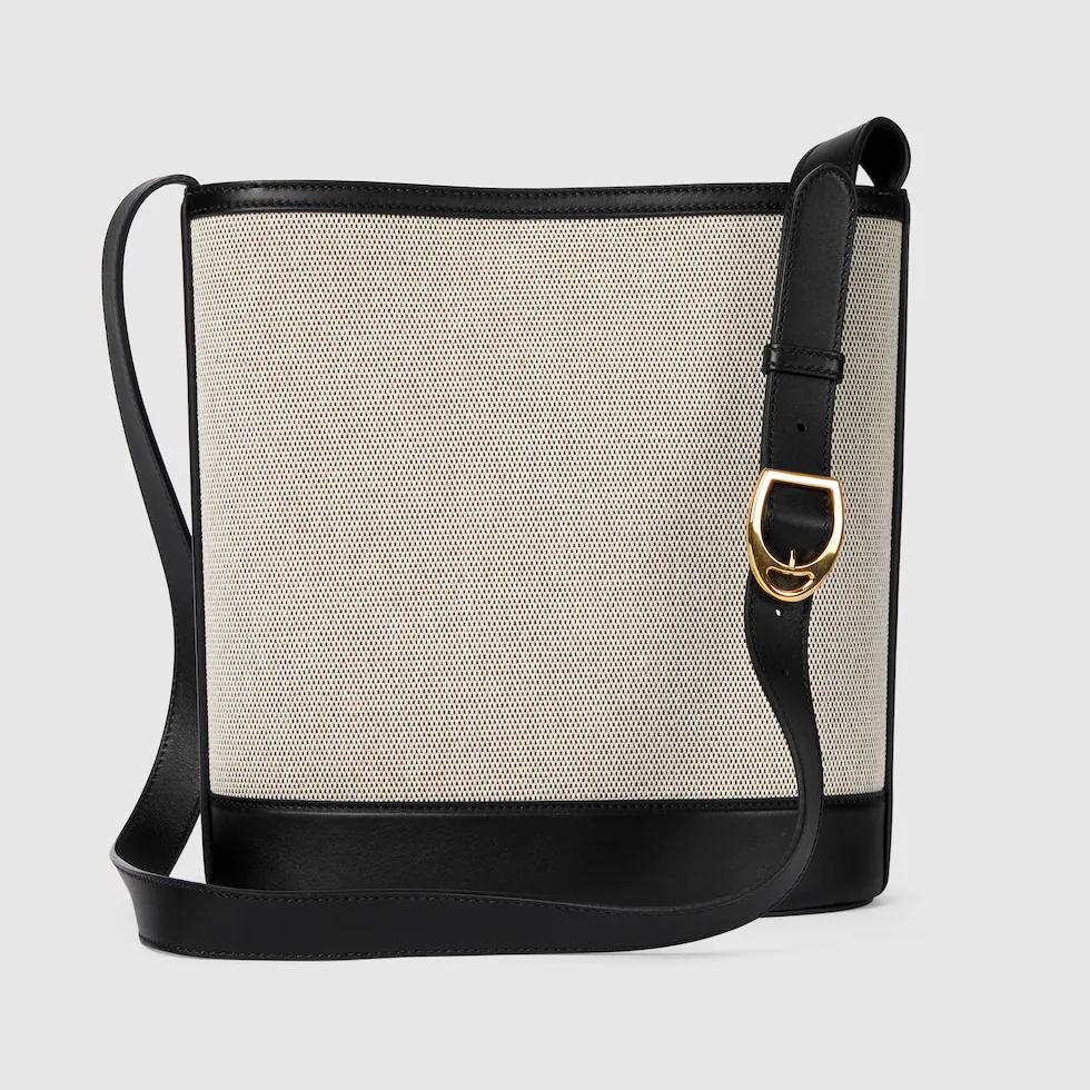 In the 2025 Spring/Summer collection, the GG 73 series takes inspiration from a classic bucket bag that was launched in the same year as the series name. This bag interprets the horsebit-shaped accessories with a modern aesthetic and can be worn crossbody, on the shoulder, or used as a handbag.White buckskinMaterial: Smooth leather, gold-toned bamboo joint hardware, brown cotton-linen blend lining. Inside: One zippered pocket.Dimensions: 26 x 27.5x 11.5 cm?