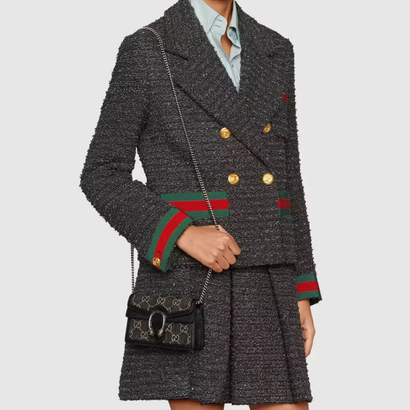 Reminiscent of an archival symbol, the textured tiger head spur is the Dionysus' defining feature. The feline appears?throughout the universe, expressing the House's fascination with the wild beauty of the natural world. Here, the antique silver-toned hardware is paired with a black and ivory GG denim jacquard.