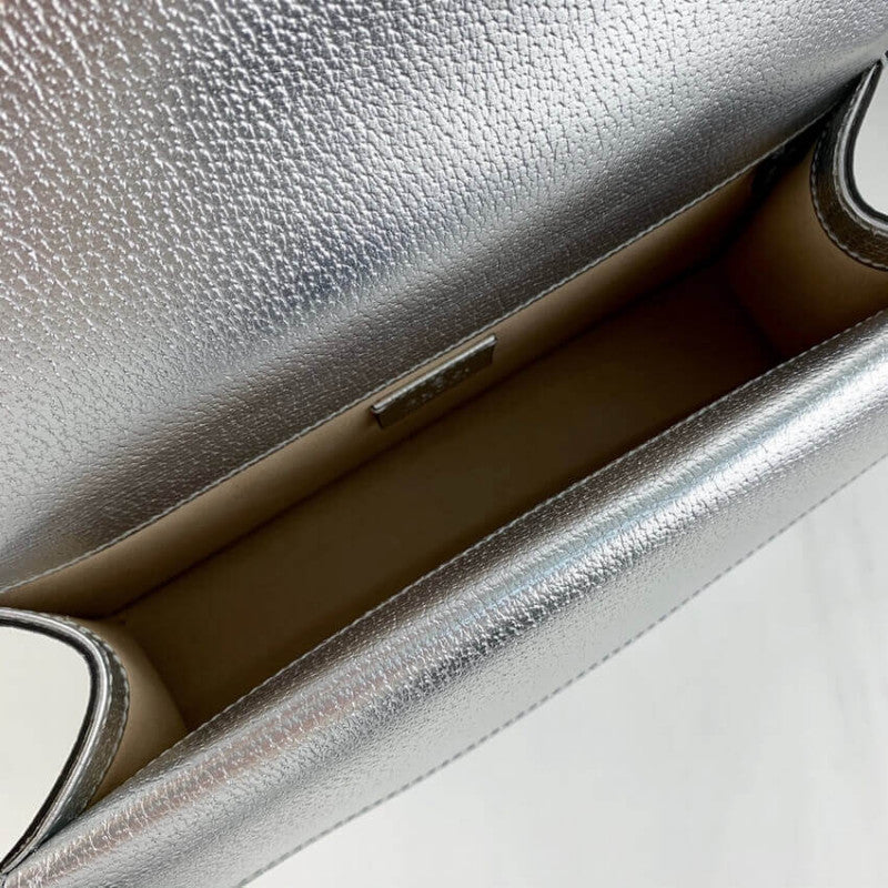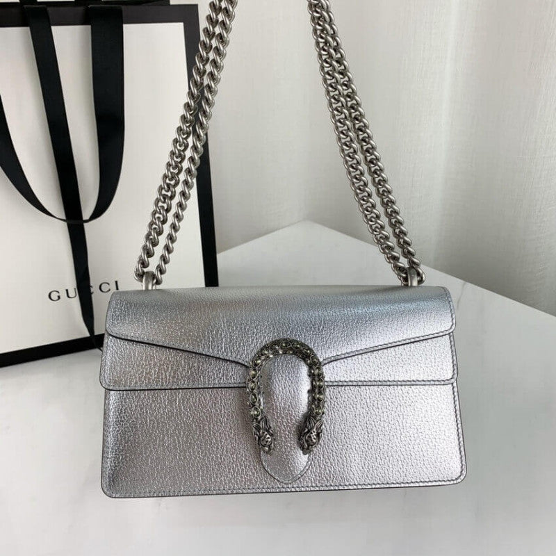 The Dionysus shoulder bag is presented in shiny silver leather. The now defining tiger head closure?aa unique detail referencing the Greek god Dionysus, who in myth is said to have crossed the river Tigris on a tiger sent to him by Zeus?ais further enhanced with sparkling crystals. The sliding chain strap can be worn multiple ways, changing between a shoulder, crossbody and a top handle bag.