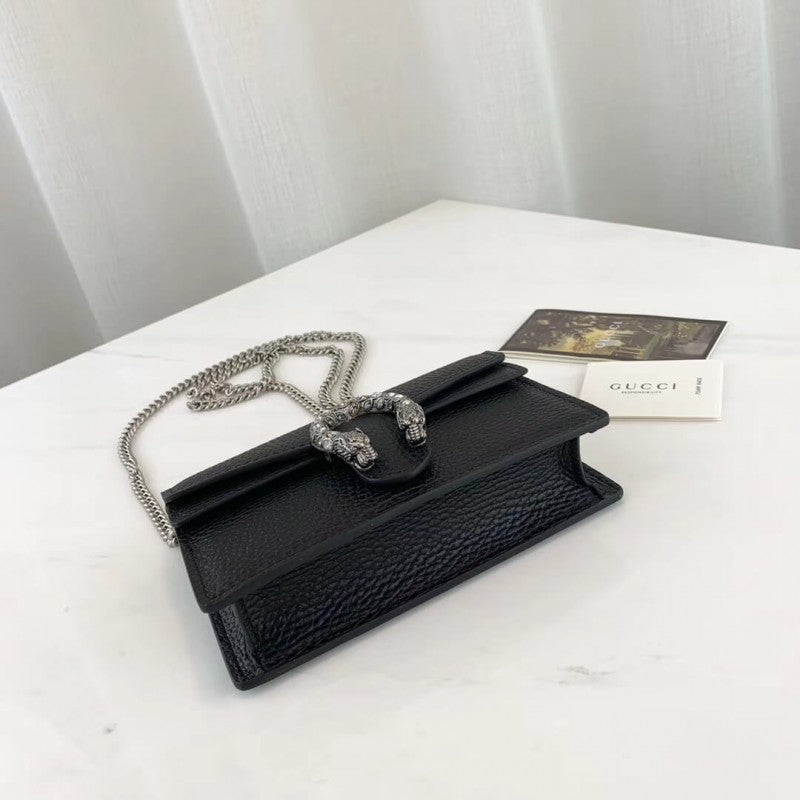 A structured leather chain super mini bag with a key ring that can be used to attach this bag to a separate larger bag. The closure has the textured tiger head spur closure-a unique detail referencing the Greek god Dionysus, who in myth is said to have crossed the river Tigris on a tiger sent to him by Zeus. The tiger head closure is enriched with Swarovski crystal stones. Made in resistant textured leather.