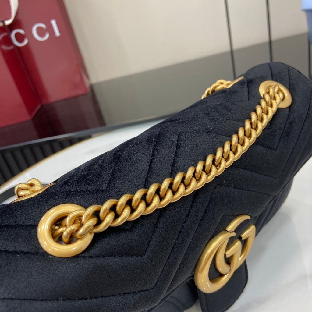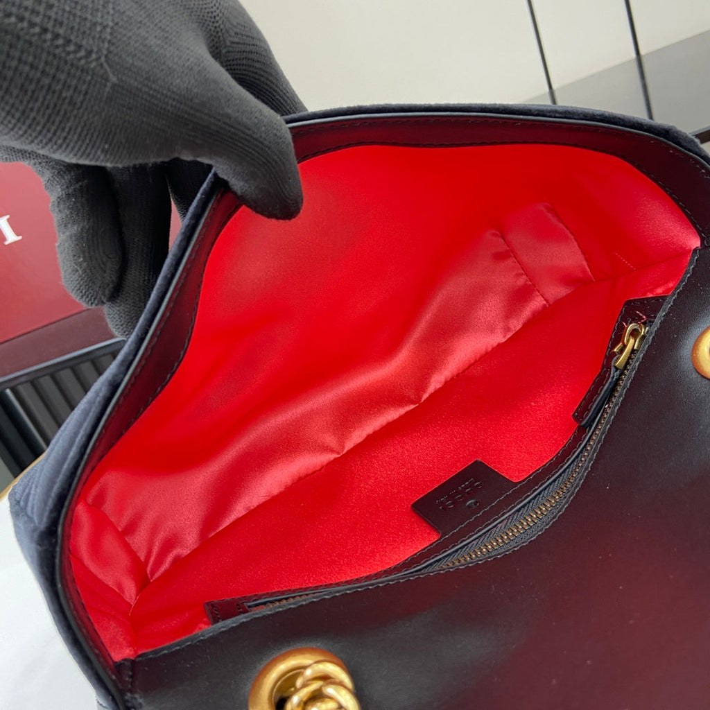 The GG GG Marmont chain shoulder backpack showcases a soft yet structured silhouette with an oversized flap closure, accented by double G metal hardware. The adjustable chain shoulder strap offers multiple styling options, enabling effortless switching between shoulder carry and hand carry. Crafted from wavy quilted velvet fabric, it features the iconic GG logo on the back.