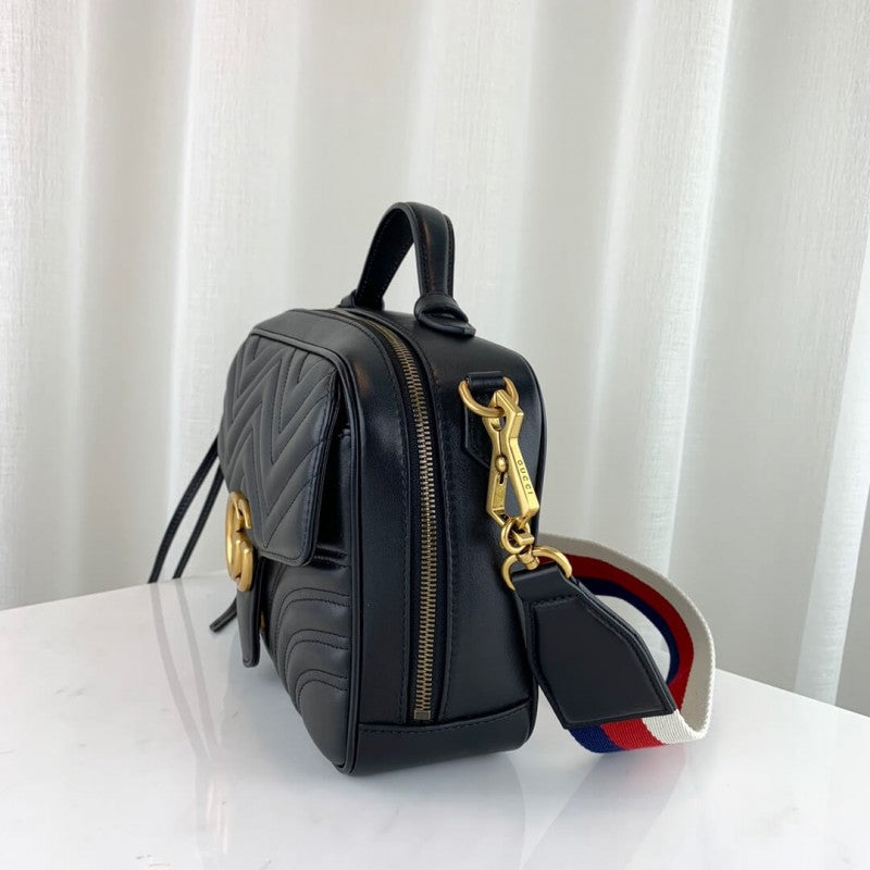 The GG Marmont shoulder bag has a softly structured shape with zip around closure and an oversized front flap with Double G hardware. The shoulder strap features the Sylvie Web stripe, an evolution of the GG Web in blue, red and white. Made in matelass??¨¬| chevron leather with a heart on the back.