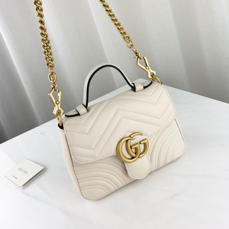 A new introduction to the GG Marmont line for Cruise 2019, the mini GG Marmont top handle bag has a softly structured shape and an oversized flap closure with Double G hardware. Equipped with a leather top handle and chain shoulder strap, made in matelass??¨¬| chevron leather with a heart on the back.
