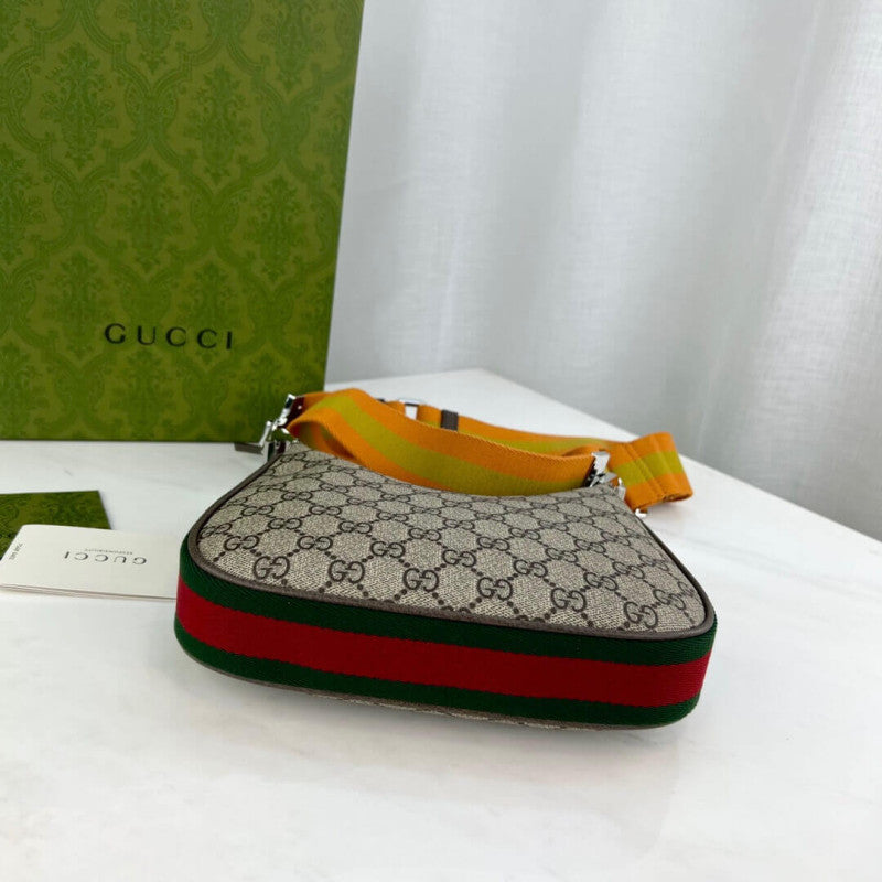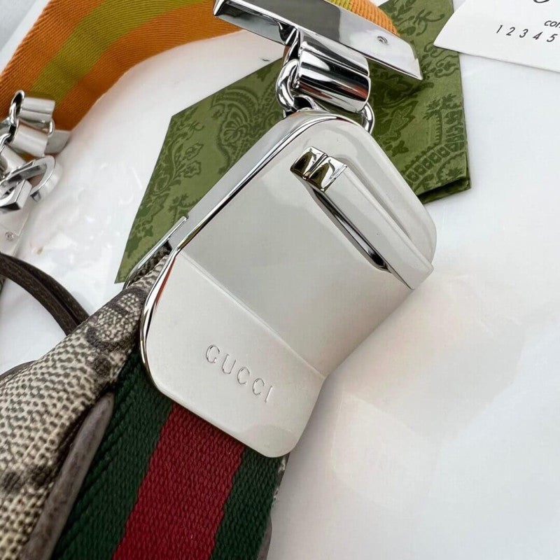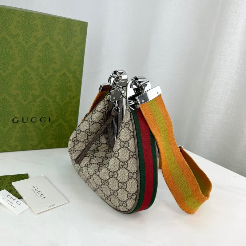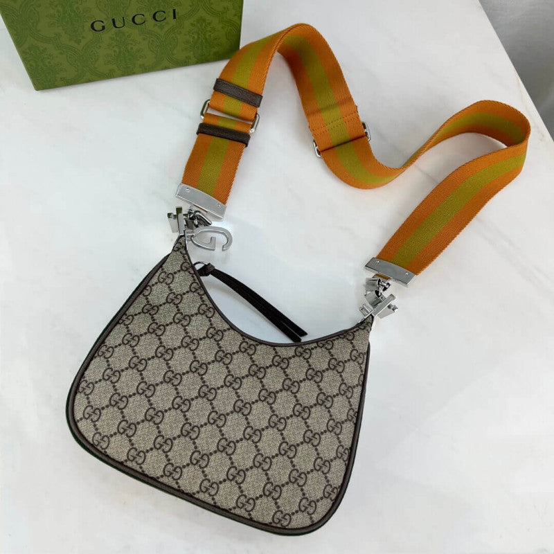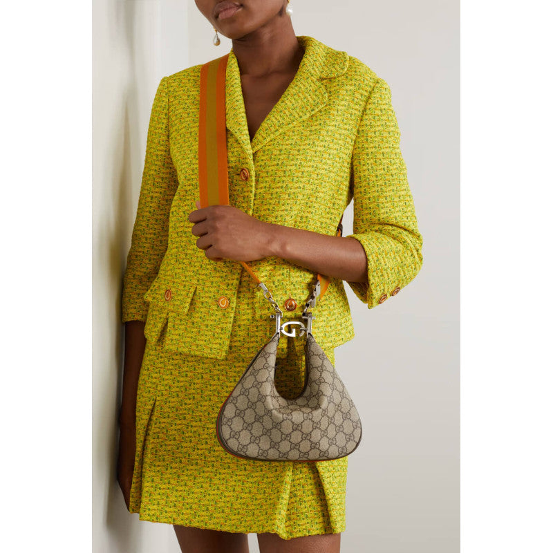 An ode to the timeless Hollywood glamour that shaped GG Love Parade, classic elements from the House's archives are reintroduced. Distinguished by its crescent moon shape, the accessory is further defined by a G shaped hook closure. Paired with soft materials, the heritage hardware creates a refined design with vintage appeal. This large version is crafted in beige and ebony GG Supreme canvas with brown leather trim.