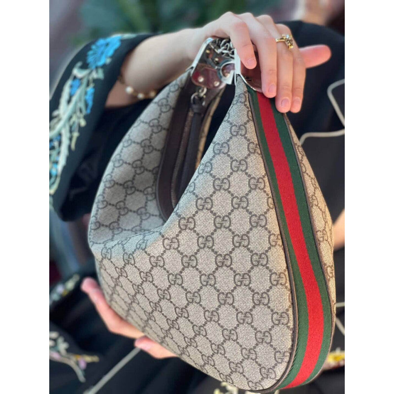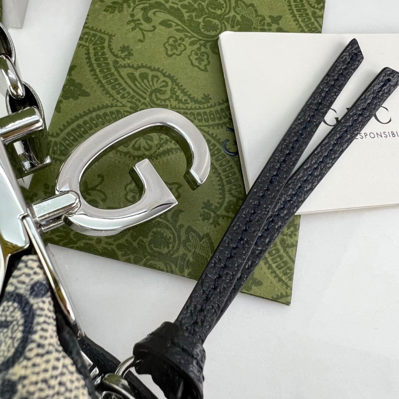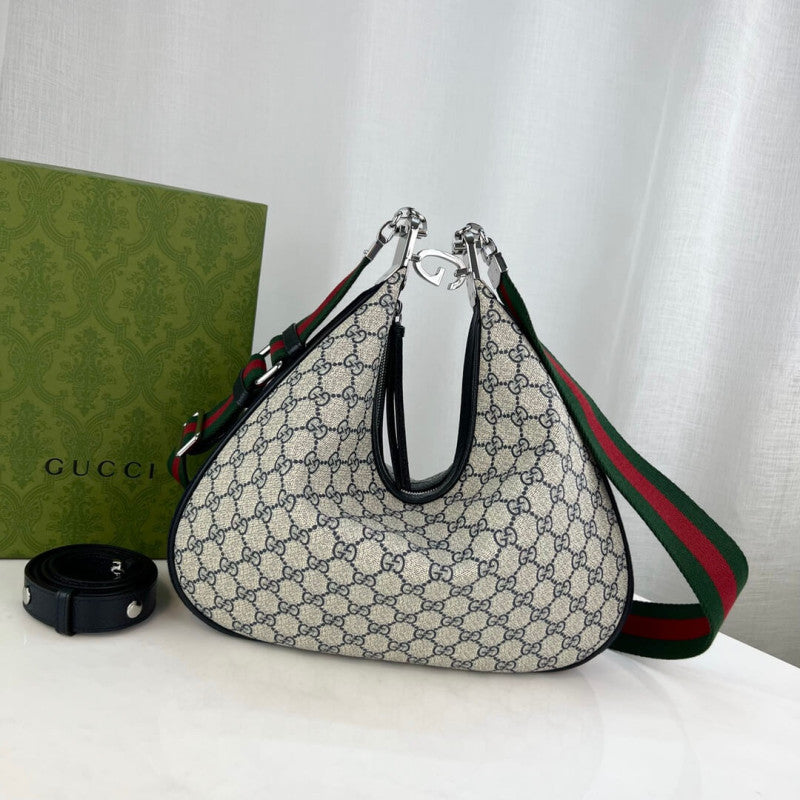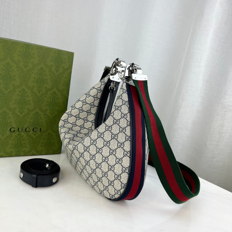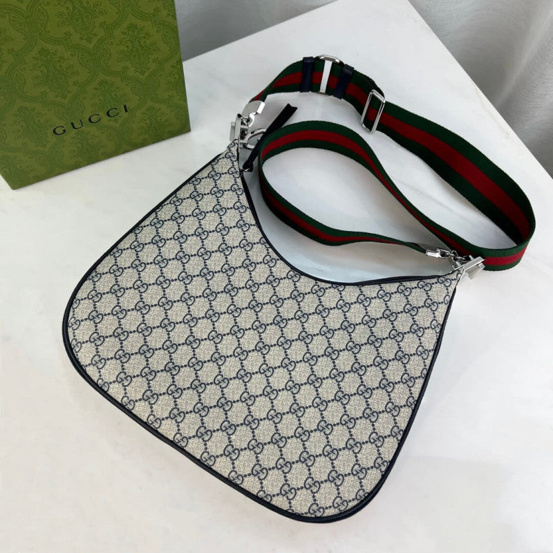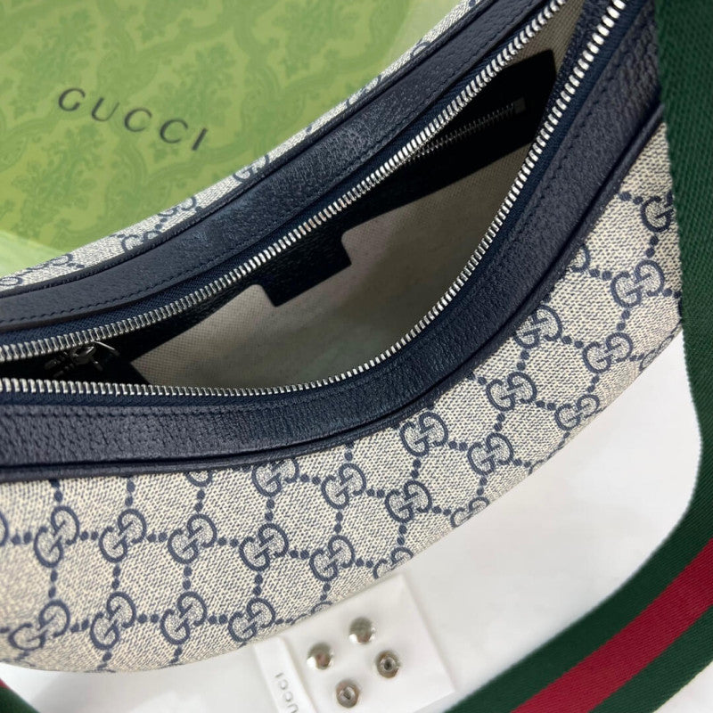 An ode to the timeless Hollywood glamour that shaped GG Love Parade, classic elements from the House's archives are reintroduced. Distinguished by its crescent moon shape, the accessory is further defined by a G shaped hook closure. Paired with soft materials, the heritage hardware creates a refined design with vintage appeal. This medium version is crafted from beige and blue GG Supreme canvas, complete with a blue and red Web trim.