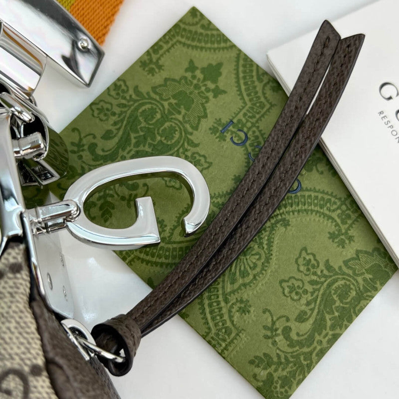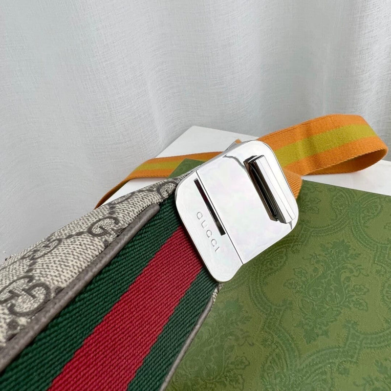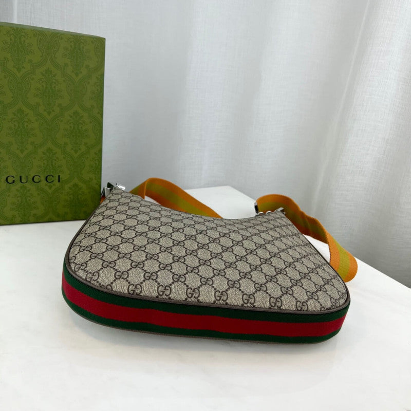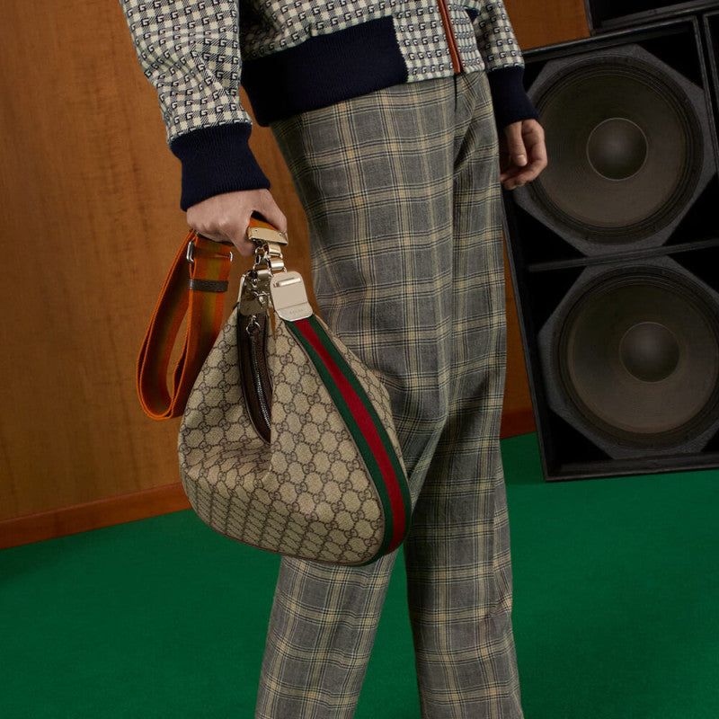 An ode to the timeless Hollywood glamour that shaped GG Love Parade, classic elements from the House's archives are reintroduced. Distinguished by its crescent moon shape, the accessory is further defined by a G shaped hook closure. Paired with soft materials, the heritage hardware creates a refined design with vintage appeal. This medium version is crafted from beige and blue GG Supreme canvas, complete with a blue and red Web trim.