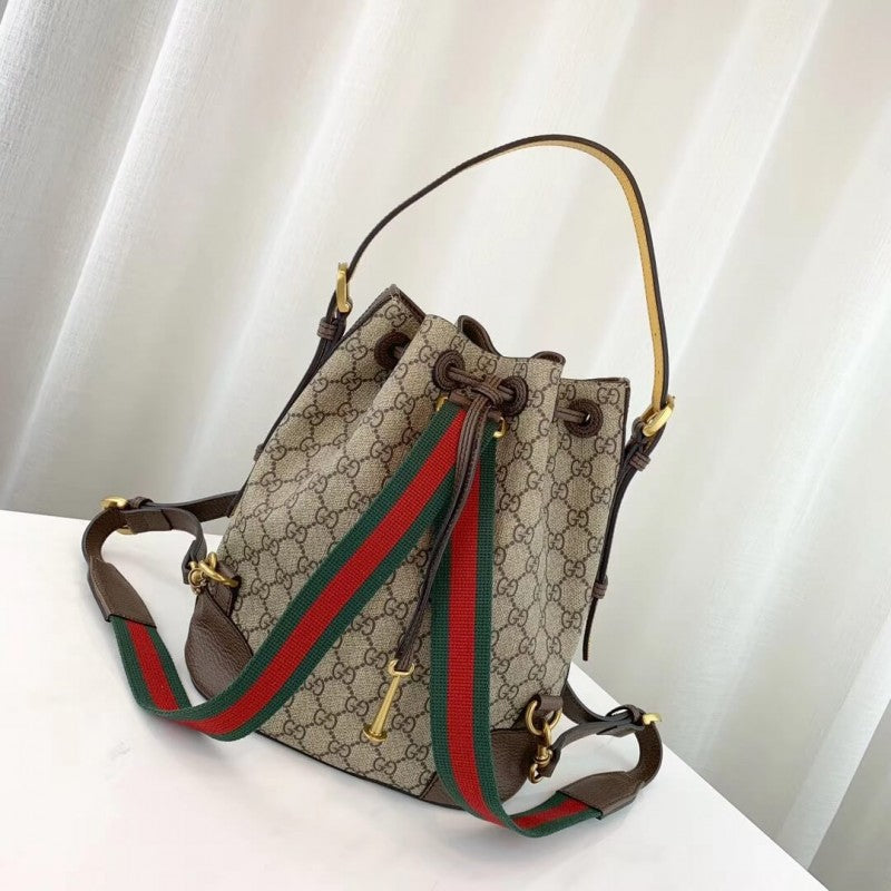A drawstring backpack with a bucket shape made in soft GG Supreme, crafted from a coated microfiber fabric. The back shoulder straps come with a mechanism that allows them to be released and adjusted to be worn as a shoulder strap. The contrast handle pays homage to the House??¡ê¡ès past, when artisans would repair luggage by replacing worn handles with new ones in any colors that were available.