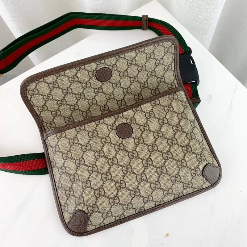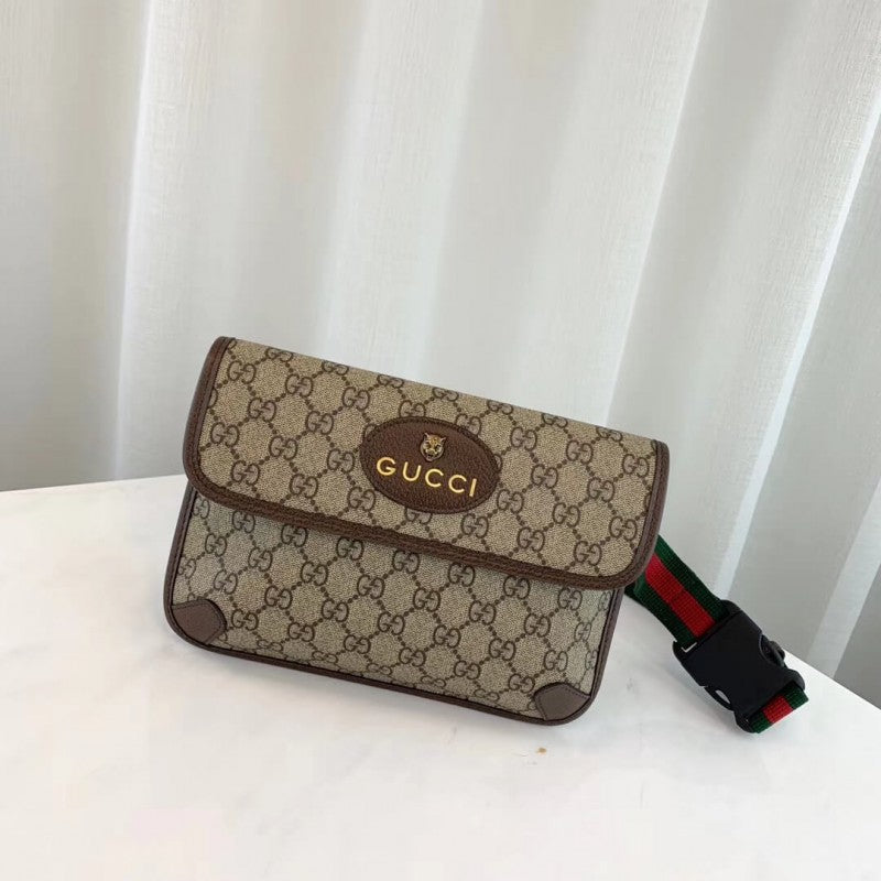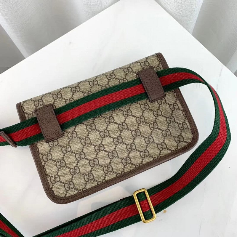 The belt bag in GG Supreme has a retro influenced design. Trimmed with leather, the style is meant to be worn along the waist, securing with a Web strap and buckle closure.