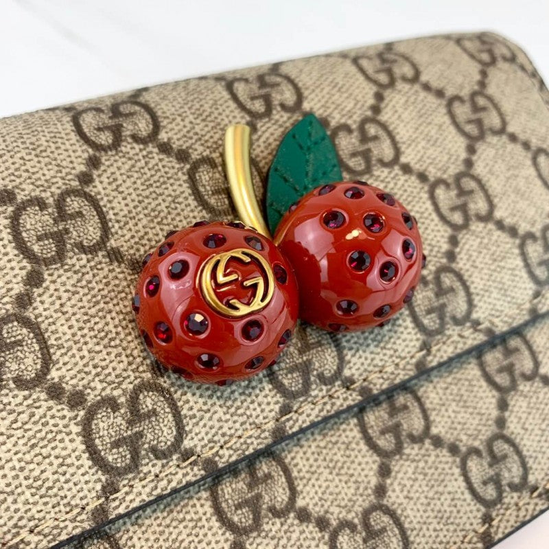 A three-dimensional cherry accessory with encrusted crystals stands out against the GG background for a playful touch.