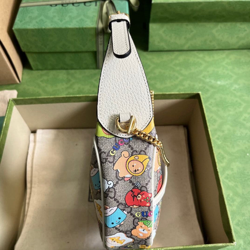 The artwork by America-based illustrator and designer, Angela Nguyen, also known as 'Pikarar', adds a playful touch to ready-to-wear pieces and accessories with vibrant prints or embroideries inspired by pop culture, anime, and animals. Here this mini bag is defined by a GG animal print.?