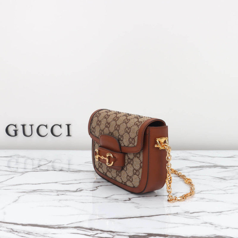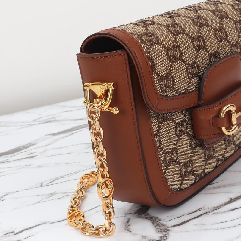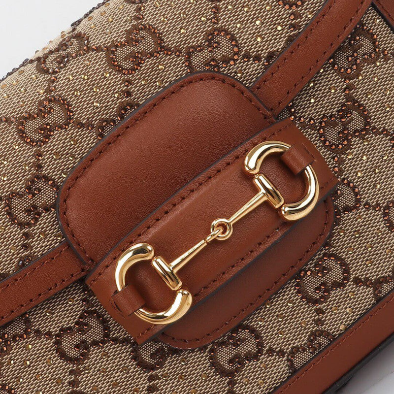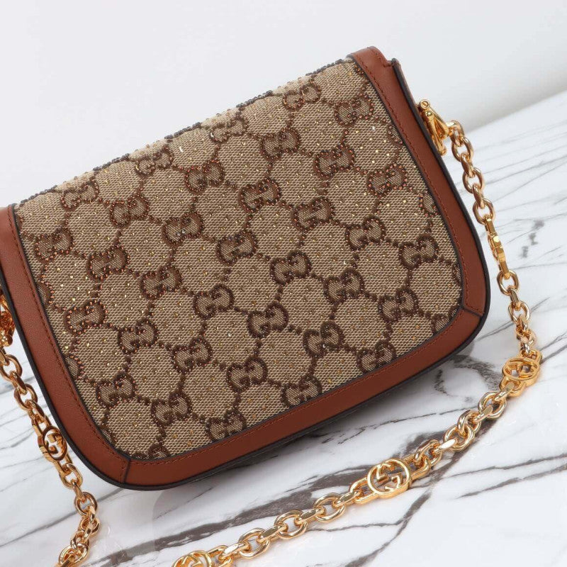 Presented in camel and ebony GG canvas, this bag is further enhanced by crystals. The structured shape and clean lines of the GG Horsebit 1955 highlights the collection's signature gold-toned hardware. Part of GG??¡ê¡ès genetic code, the double ring and bar design has been established as one of the most distinctive elements among the House symbols borrowed from the equestrian world. A delicate chain strap with monogram details adds a refined note to the style.