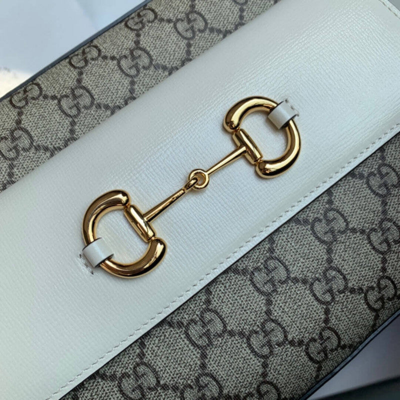 The Horsebit has become synonymous with the brand. Tracing back to GG's equestrian roots, the double ring and bar design is a piece of the House's heritage. Inspired by archival designs, the GG Horsebit 1955 unifies original details first introduced over six decades ago with a modern spirit. For Epilogue, the line is enriched with a large shoulder bag in GG Supreme canvas with contrasting white leather details and a special mechanism that adjusts the length of the shoulder strap so it can be carried on one shoulder or cross body.