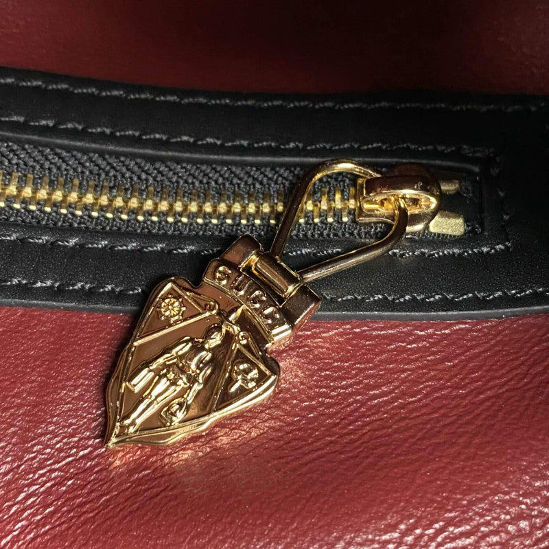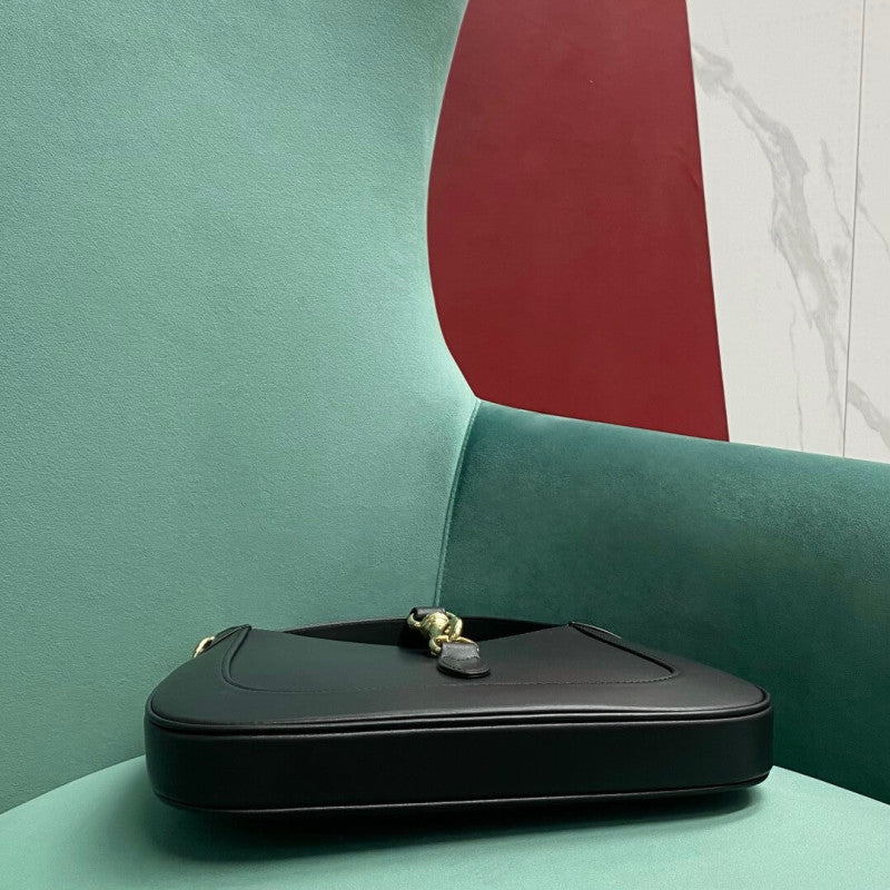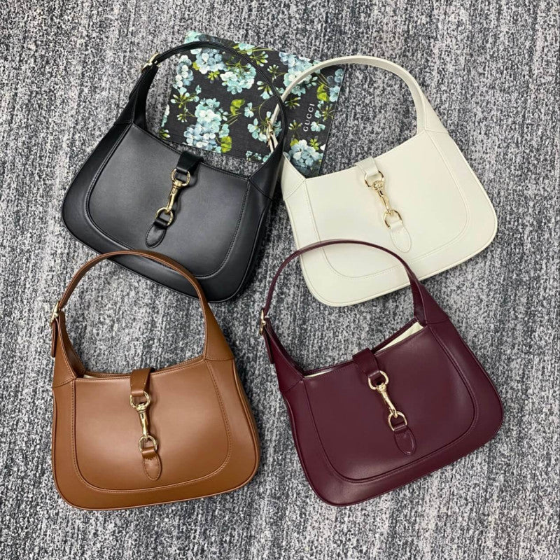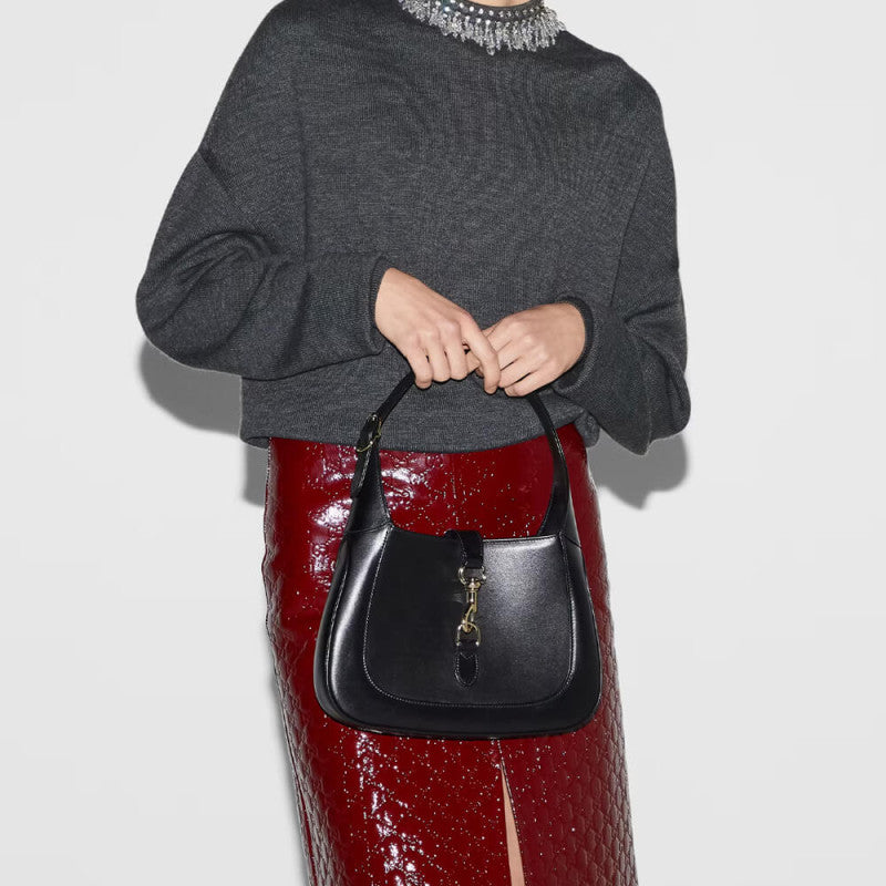 The new GG Jackie is crafted from premium fine leather which highlights the craftsmanship, crescent shape, and sleek silhouette of the House's iconic shoulder bag. Light gold-toned hardware, leather trim, and an additional Web strap gives this GG Jackie large shoulder bag in light grey leather further styling options.