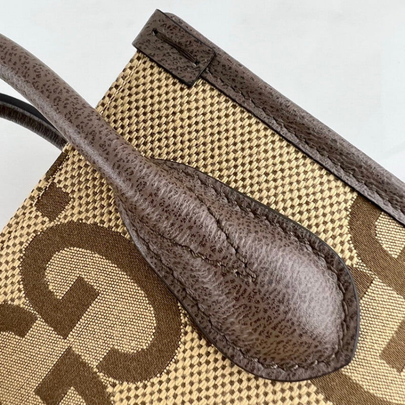 First seen as part of GG Aria, the jumbo version of the emblematic GG motif returns atop signature luggage pieces, imbuing each design with a pronounced logo feel. This mini tote bag is accentuated by the signature green and red House Web, a contemporary take on a GG archival belt buckle from the '70s.