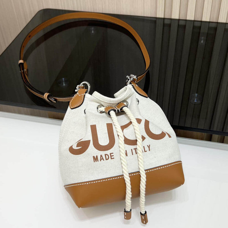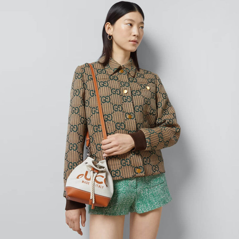 Well-known prints of the House constantly evolve to tell a unique narrative. An essential storytelling element of the Cruise 2024 collection, the 'GG Made in Italy' print defines this beige canvas shoulder bag with a light brown trim and GG Supreme lining.