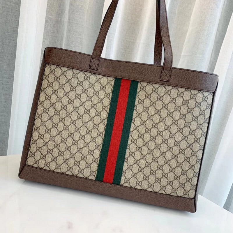 A classic combination of the House's most recognizable elements?athe GG motif and Web stripe?athe world of Ophidia continues to evolve, incorporating new shapes and silhouettes. The wide tote is made from supple soft GG Supreme canvas, trimmed with textured leather and topped with Double G hardware.