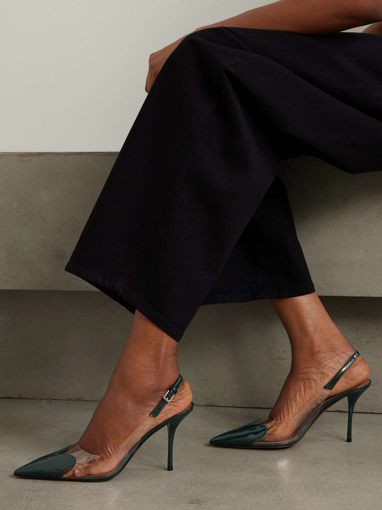 The pointed toes on pumps feature the same? Le Coeur hearts seen on the namesake bags. Crafted in Italy from patent-leather and PVC, they have 90mm heels and buckle-fastening slingback straps.