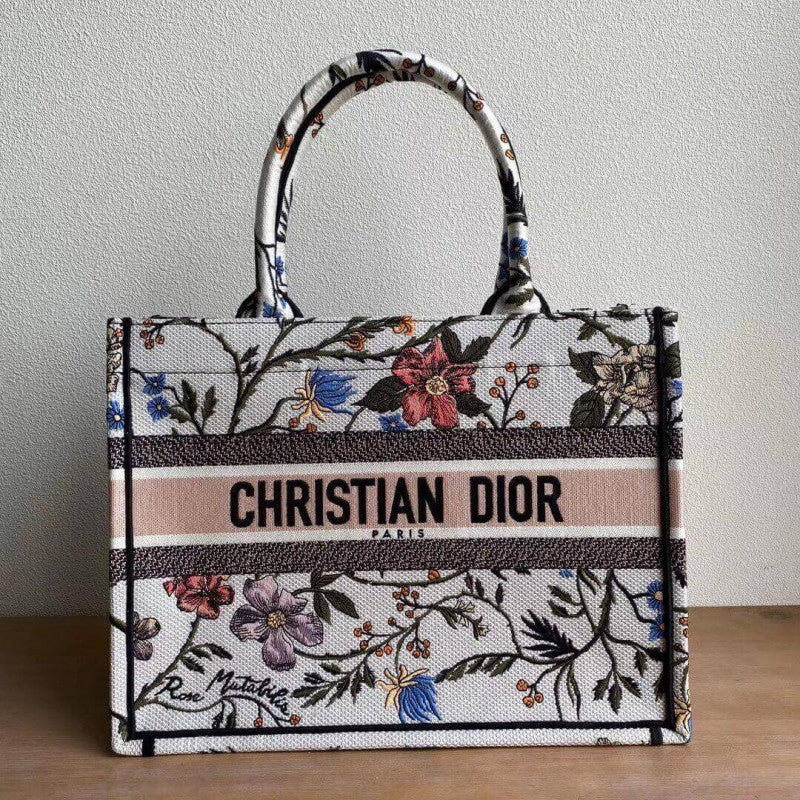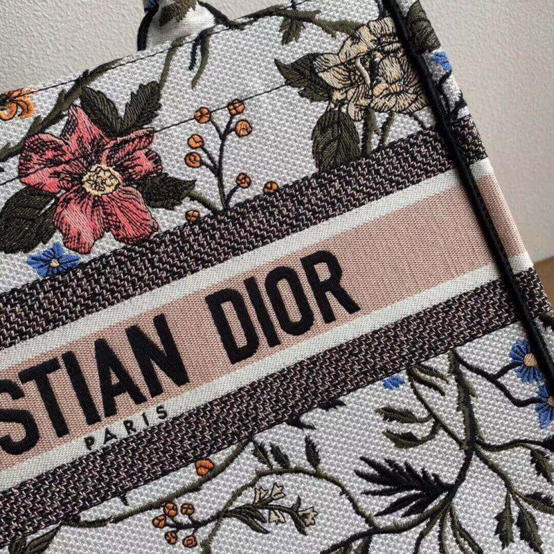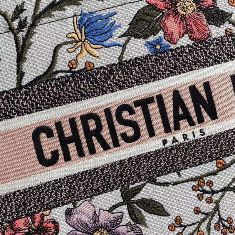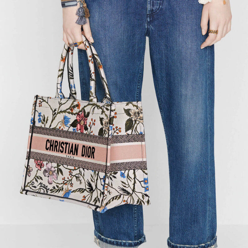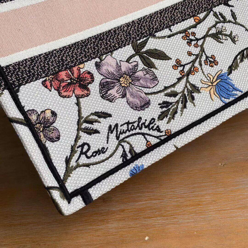 The Book Tote, an original style introduced by Creative Director Maria Grazia Chiuri, has become a staple of the aesthetic. Ideally designed to carry all your daily essentials, the small shape portrays a fully embroidered Rosa Mutabilis motif with the 'Christian ' signature on the front. This carryall is a perfect example of the savoir-faire and combines well with small accessories like the Mitzah scarf.