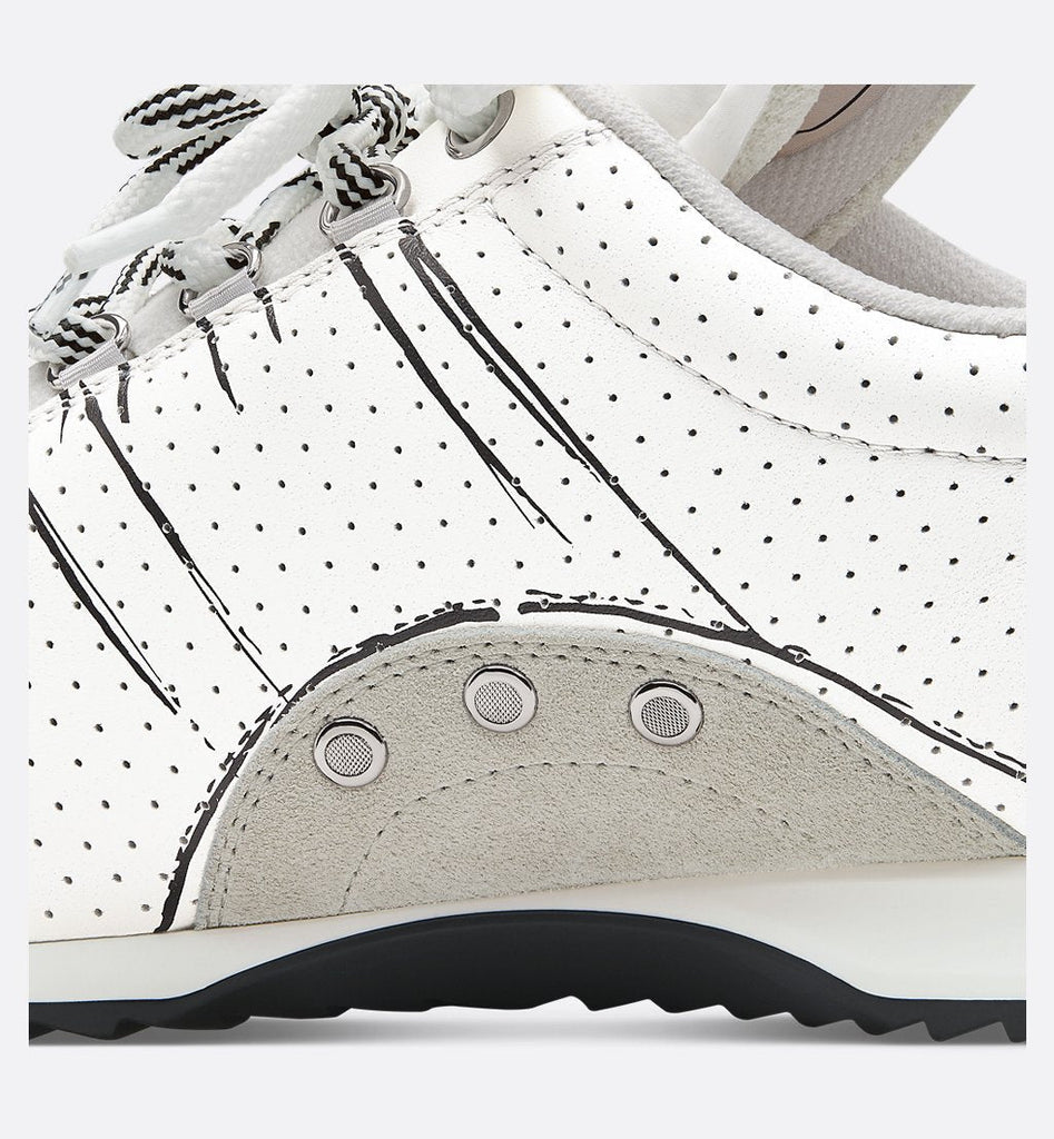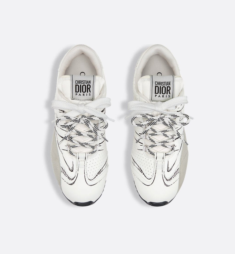 Debuting as part of the Spring-Summer 2025 Ready-to-Wear Fashion Show, reflects a hallmark retro aesthetic. Crafted in white nylon and calfskin, it features printed markings inspired by the production stages of shoemaking, panels in beige suede calfskin and double lacing. The handwritten signature appears on the sides, while a? panel and tag adorn the heel counter and tongue. Complete with a thin sole in two-tone rubber, the sneaker will lend a couture touch to any casual look.