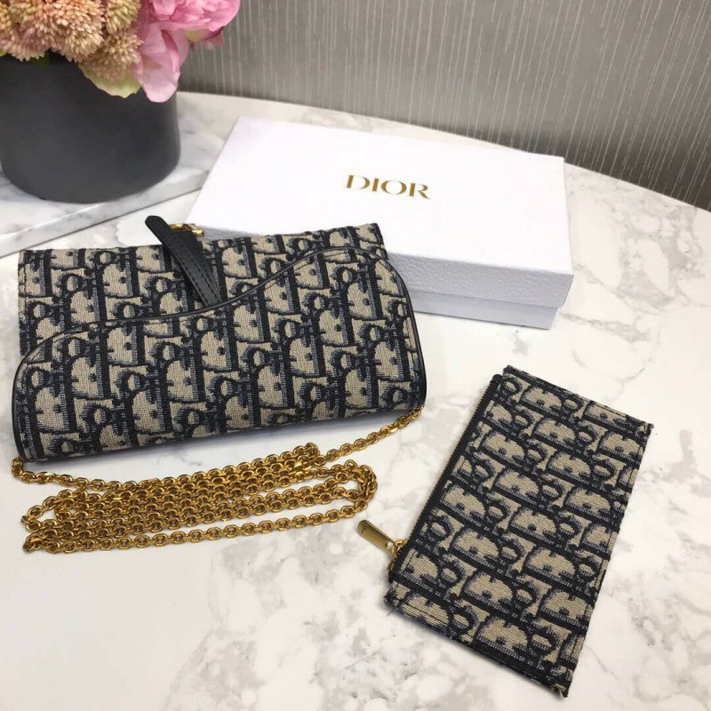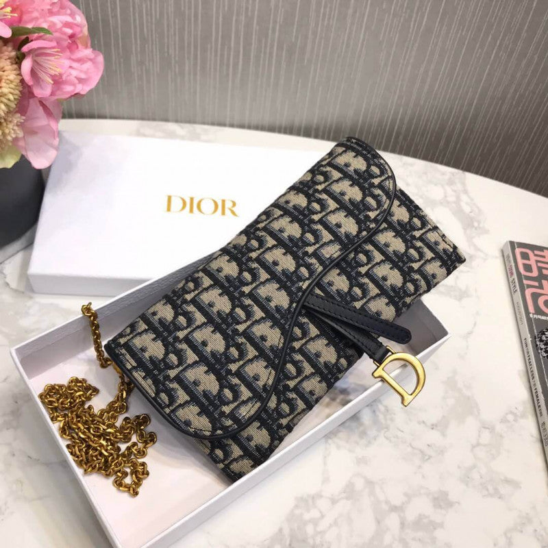 Saddle long wallet with flap in blue Oblique jacquard canvas with blue calfskin leather details.