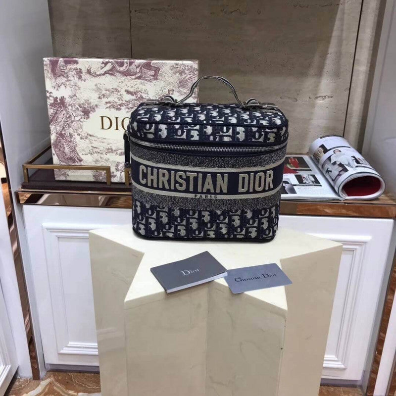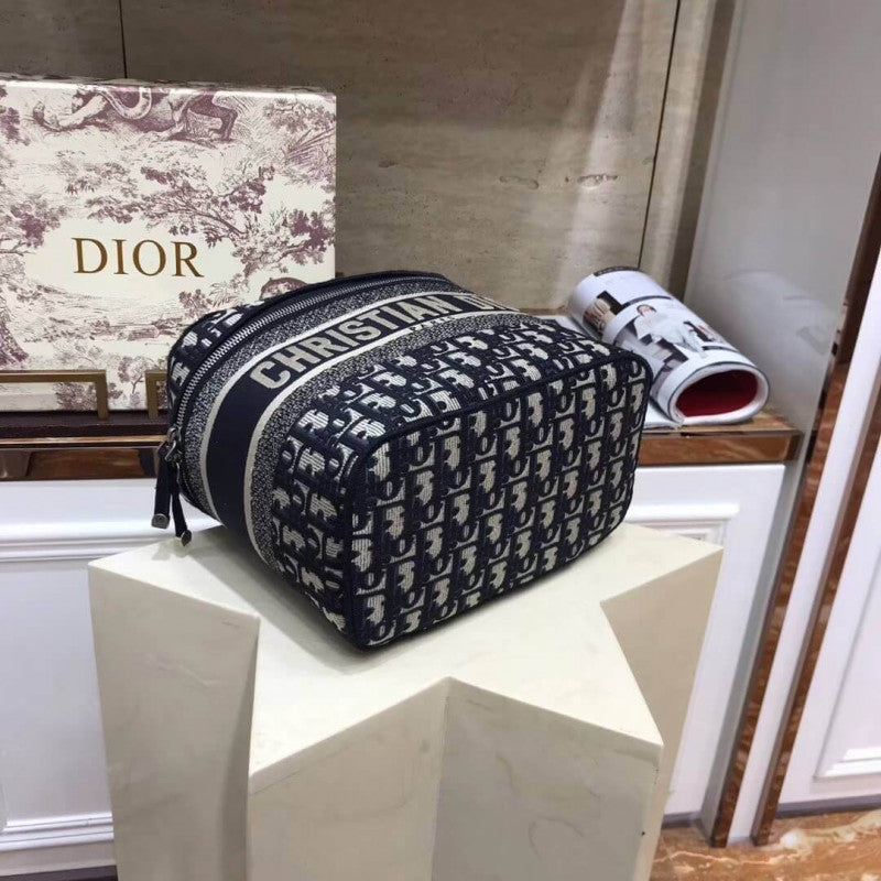The Travel vanity case is an elegant and clever accessory. Crafted in blue Oblique jacquard, it is embellished with the 'Christian ' signature on the front and features a spacious main compartment with storage space to accommodate toiletries and?makeup. This daily essential also has a handle on the top and a zipped closure. The vanity case may be paired with other Travel creations.