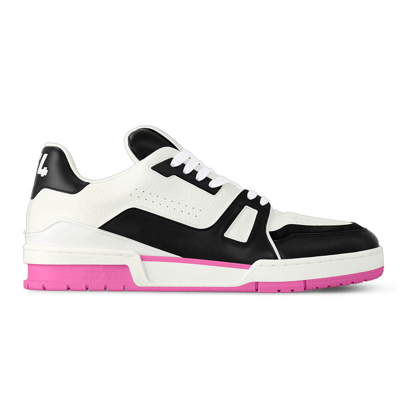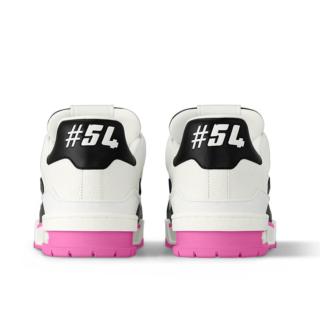 Trainer sneaker comes in grained calf leather and a black and white palette illuminated by touches of color. This iconic model was designed by Virgil Abloh, who drew inspiration from vintage basketball sneakers. It is notable for its rich details, including? in script lettering and the #54 signature, referring to 1854, when the House was founded.