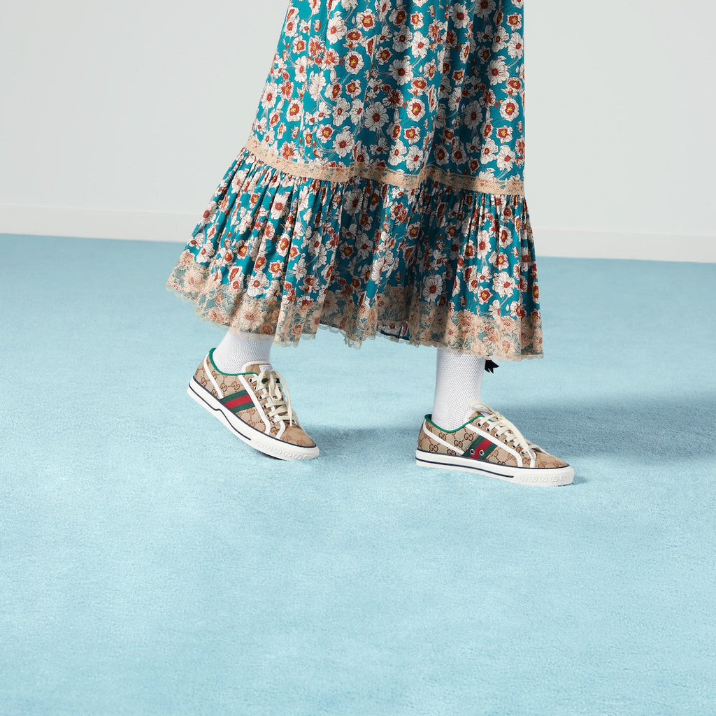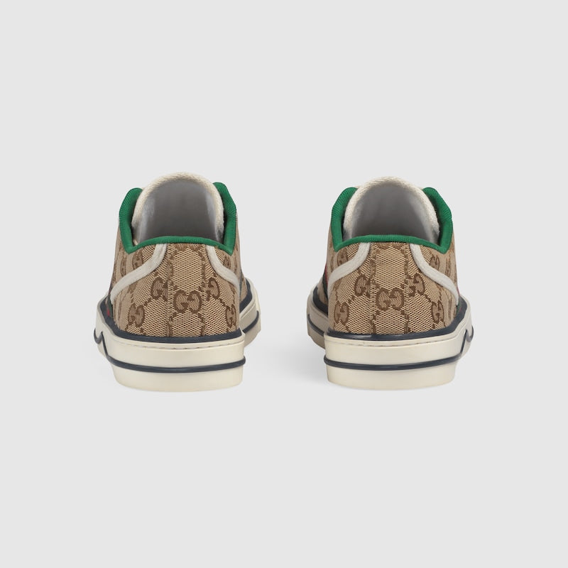 The low-top sneaker is presented in Original GG canvas in its classic color combination of beige and ebony. The style combines different elements from the House's heritage such as the GG Tennis 1977 label, a textured GG motif at the sole and the Web?adetails which recall the House's connection to the world of sports and leisure.