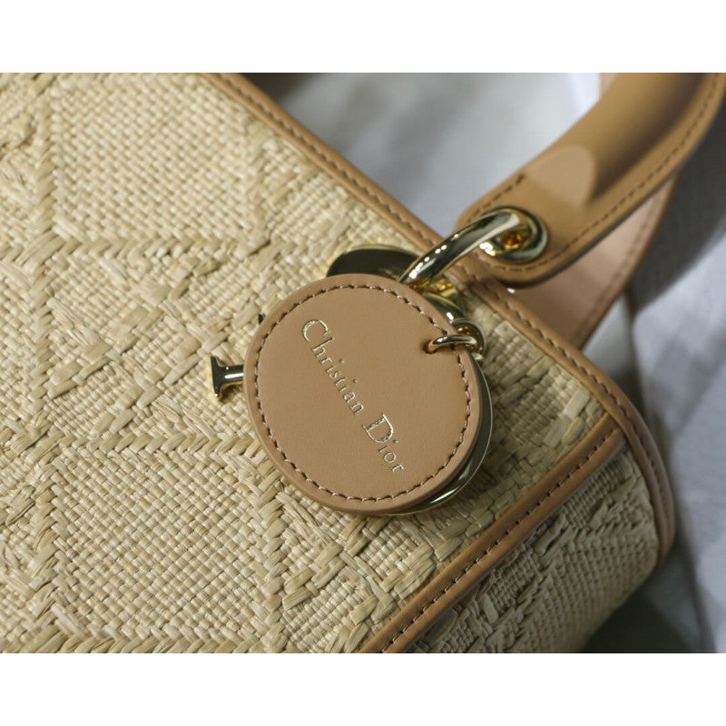 The Lady handbag epitomizes the House's vision of elegance and beauty. Sleek and refined, the style is timeless. Crafted in natural raffia, it is embellished with the iconic Cannage motif, while pale gold-finish metal charms offer an elegant allure. Featuring a thin, removable leather shoulder strap, the medium Lady bag can be carried by hand or worn crossbody.