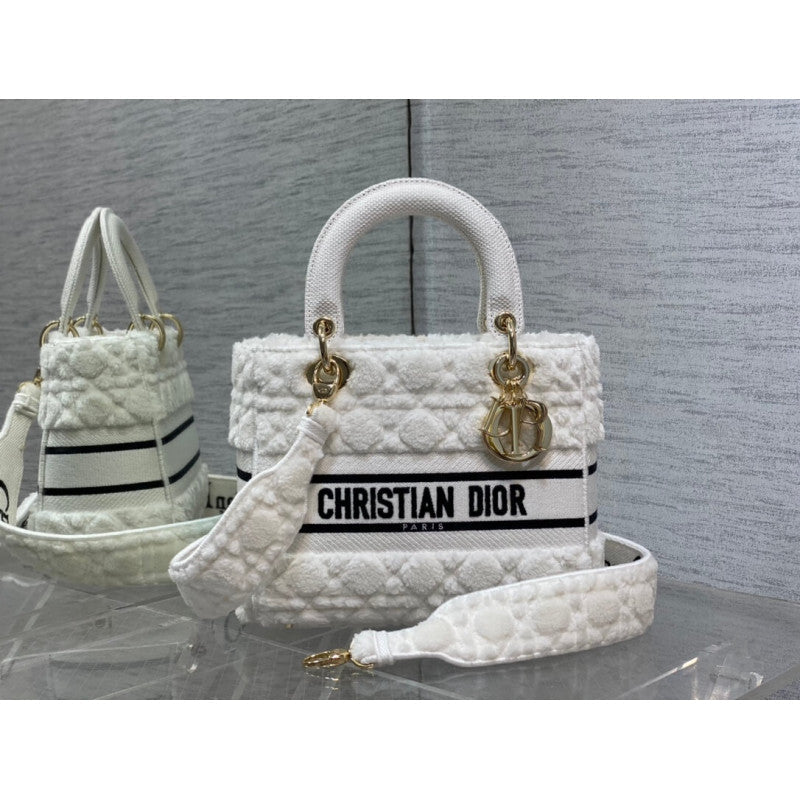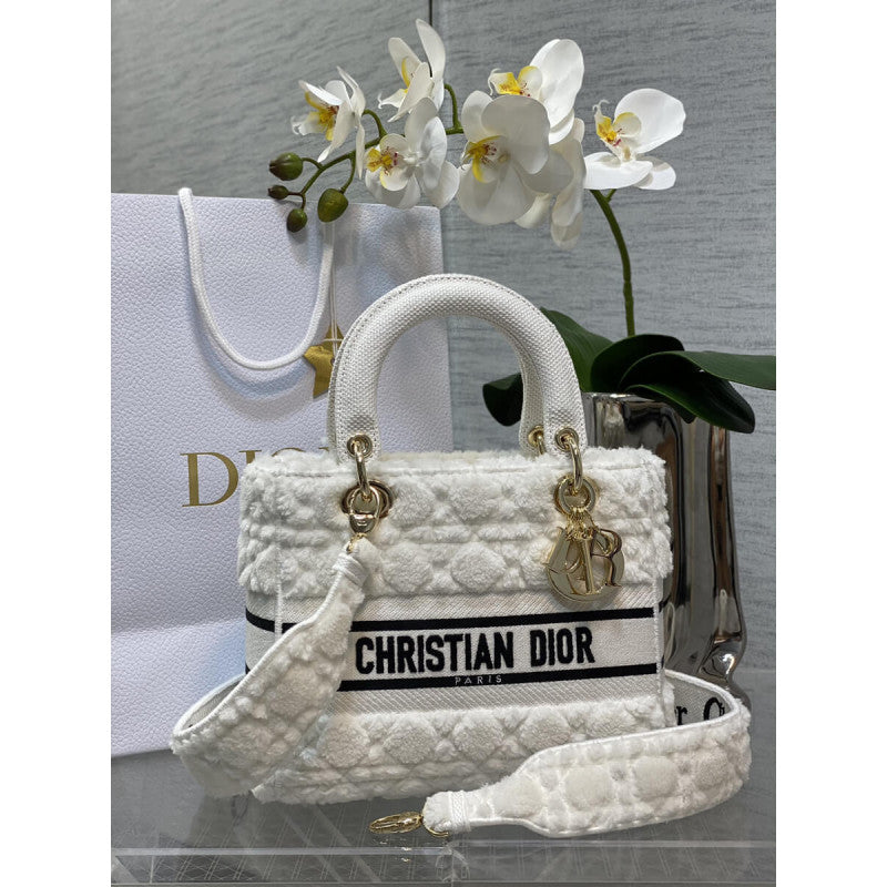 The Lady D-Lite bag combines classic elegance with House modernity. The latte shearling style showcases the Cannage motif. A 'CHRISTIAN PARIS' signature adorns the front, while charms in pale gold-finish metal further enhance and highlight the silhouette. Featuring a wide, removable and reversible embroidered shoulder strap, the medium Lady D-Lite bag can be carried by hand or worn crossbody.