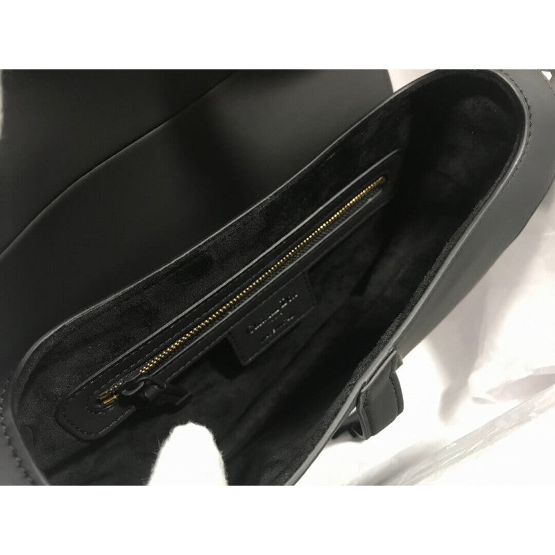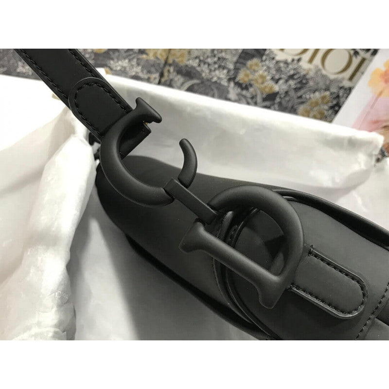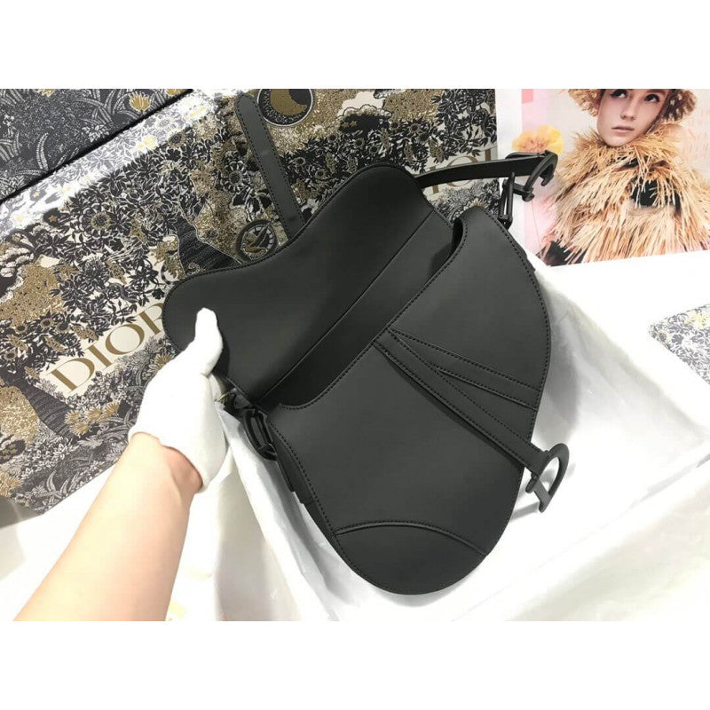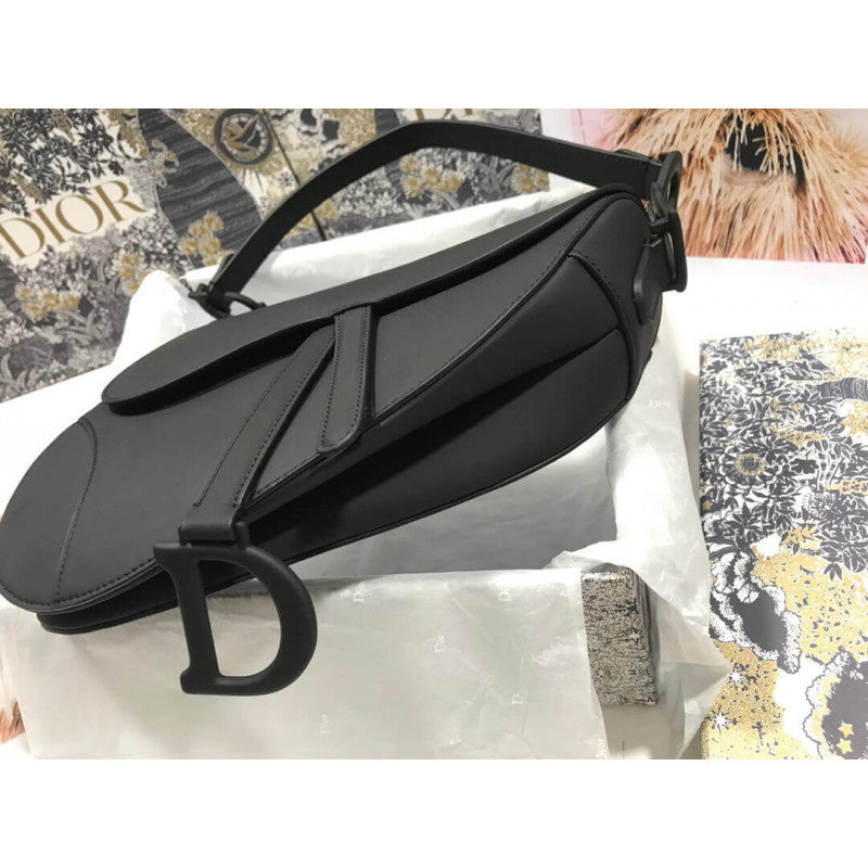 The iconic Saddle bag is reinvented once more by Maria Grazia Chiuri. Featuring a Saddle flap with a magnetic 'D' stirrup clasp, it boasts a 'CD' signature on each side of the handle. The black ultramatte calfskin style is embellished with tonal metal hardware. The Saddle bag may be carried by hand or worn over the shoulder and can be customized with different shoulder straps.