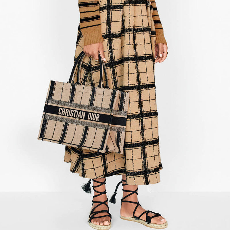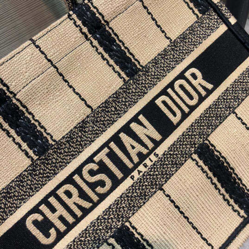 The Book Tote, an original style introduced by Christian 's creative director, Maria Grazia Chiuri, has become a staple of the aesthetic. Ideally designed to carry all your daily essentials, the small shape is fully embroidered with lurex portraying a bayad ìre print, with the debossed 'Christian ' signature on the front. This carryall is a perfect example of the savoir-faire and it may be worn with other small accessories or the Mitzah scarf for a complete look.