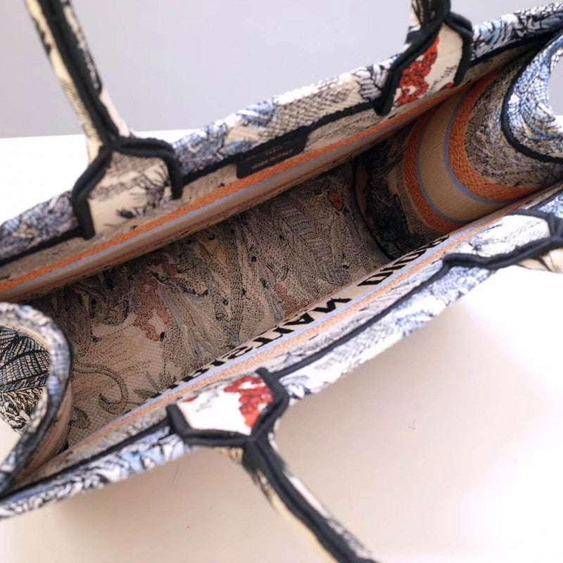 Book Tote bag in canvas embroidered with a leaf green Toile de Jouy Tropicalia motif.