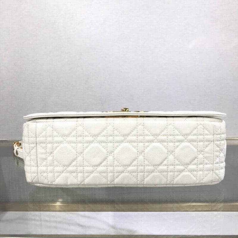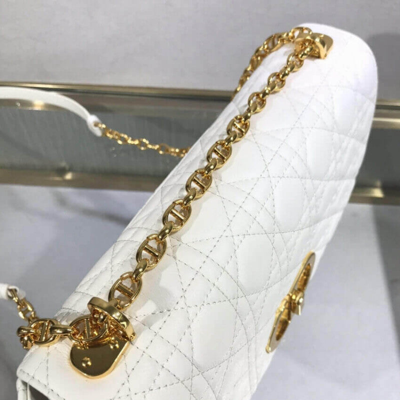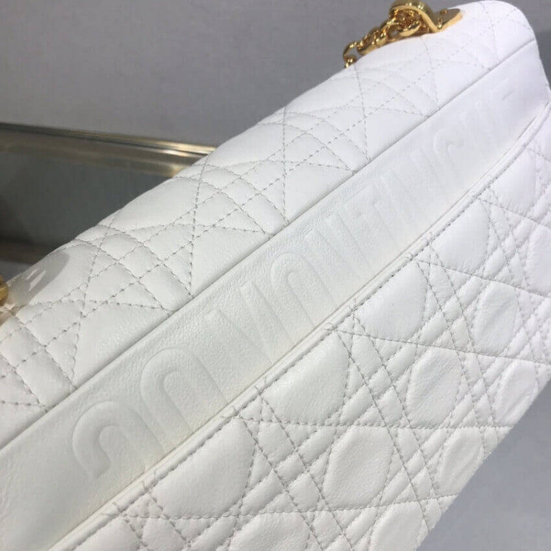 The new Caro bag boasts Cannage stitching on black calfskin, showcasing the instantly recognizable quilted texture. The supple bag features a flap with the twist 'CD' clasp, inspired by the seal of a Christian perfume bottle, styled in antique gold-finish metal. The removable signature 'CD' chain link shoulder strap can be replaced with a wide embroidered strap, allowing the large style to be worn during both the day and the evening for a modern, elegant look.