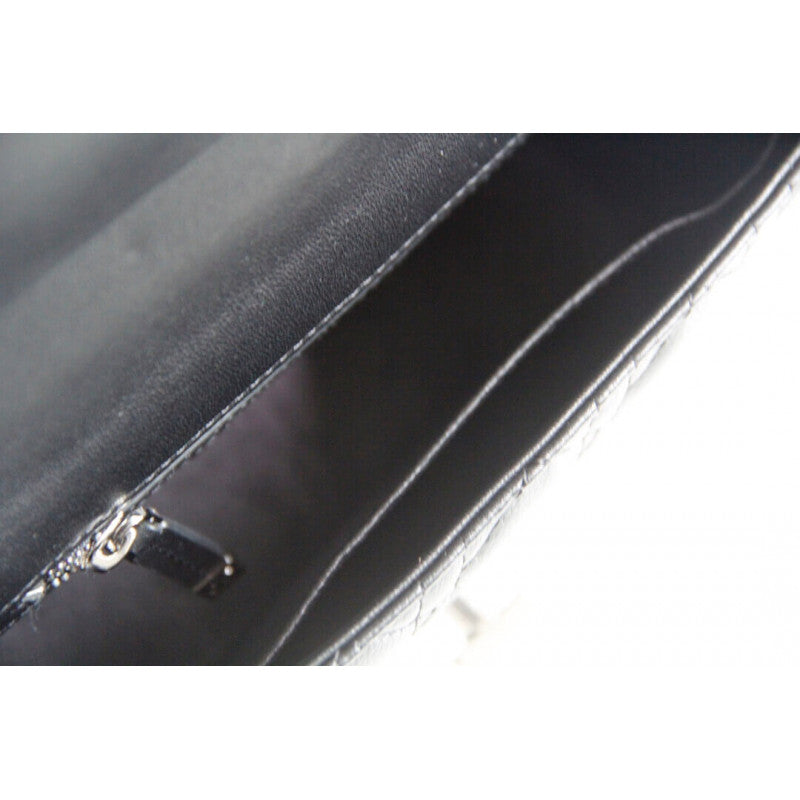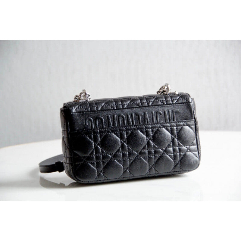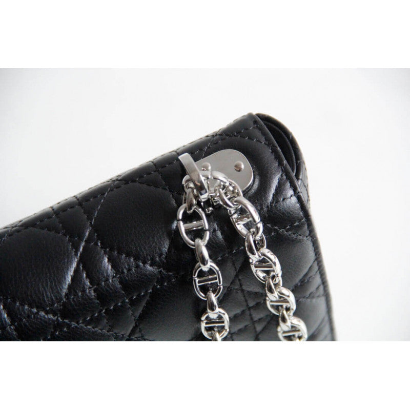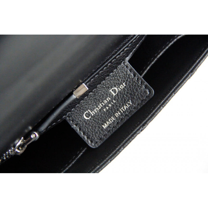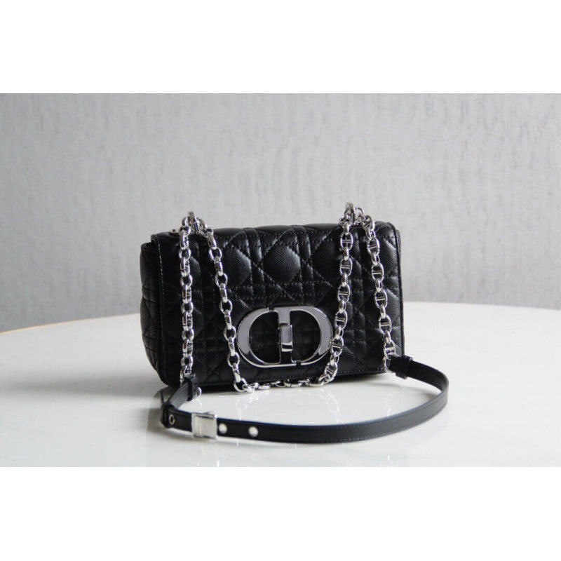 The new Caro bag boasts Cannage stitching on black calfskin, showcasing the instantly recognizable quilted texture. The supple bag features a flap with the twist 'CD' clasp, inspired by the seal of a Christian perfume bottle, styled in antique gold-finish metal. The removable signature 'CD' chain link shoulder strap can be replaced with a wide embroidered strap, allowing the large style to be worn during both the day and the evening for a modern, elegant look.