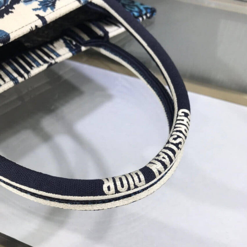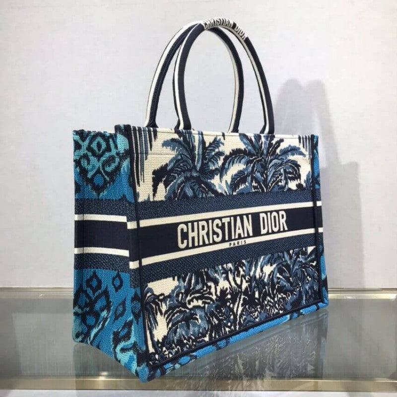 The Book Tote, an original style introduced by Creative Director Maria Grazia Chiuri, has become a staple of the aesthetic. Designed to carry all the daily essentials, the silhouette offers a new take on the hallmark Toile de Jouy with a fully embroidered variation with the blue Palms motif. The front boasts a 'Christian ' signature while a graphic motif adorns the sides for a contrasting modern touch. The carryall is a prime example of savoir-faire.