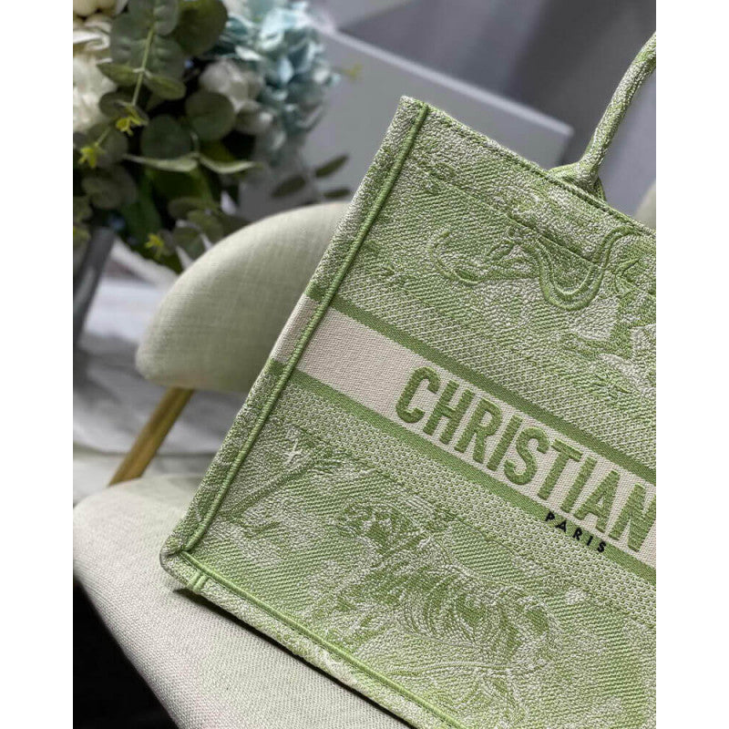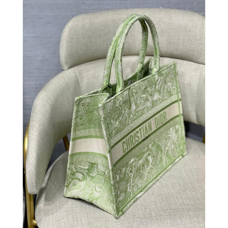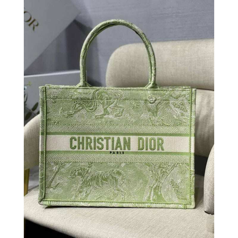 Introduced by Maria Grazia Chiuri, Creative Director of Christian , the Book Tote has become a staple of the aesthetic. Designed to hold all small daily essentials, the style has been fully embroidered with a lime Toile de Jouy Reverse motif, a variation of the House's hallmark pattern with a play on reversed colors. Adorned with the 'CHRISTIAN ' signature on the front, the small tote exemplifies the House's signature savoir-faire and may be carried by hand or worn over the shoulder.