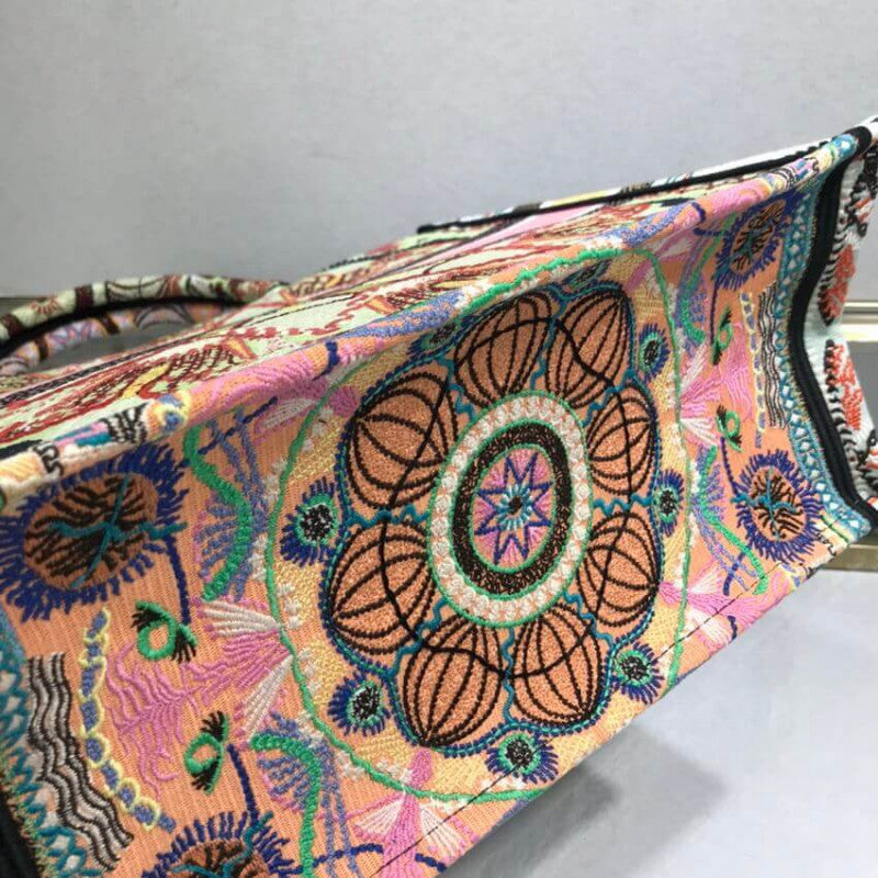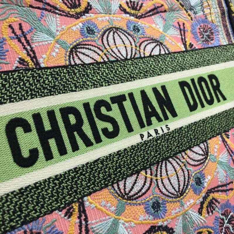 The Book Tote, an original style introduced by Creative Director Maria Grazia Chiuri, has become a staple of the aesthetic. Inspired by the light festivals in the south of Italy, this style is embroidered with the graphic multicolor In Lights motif accented with metallic thread. Each of the four sides of this bag features a different color for a patchwork look. Adorned with the 'Christian ' signature, the Book Tote exemplifies the House's signature savoir-faire and may be paired with other seasonal In Lights creations.