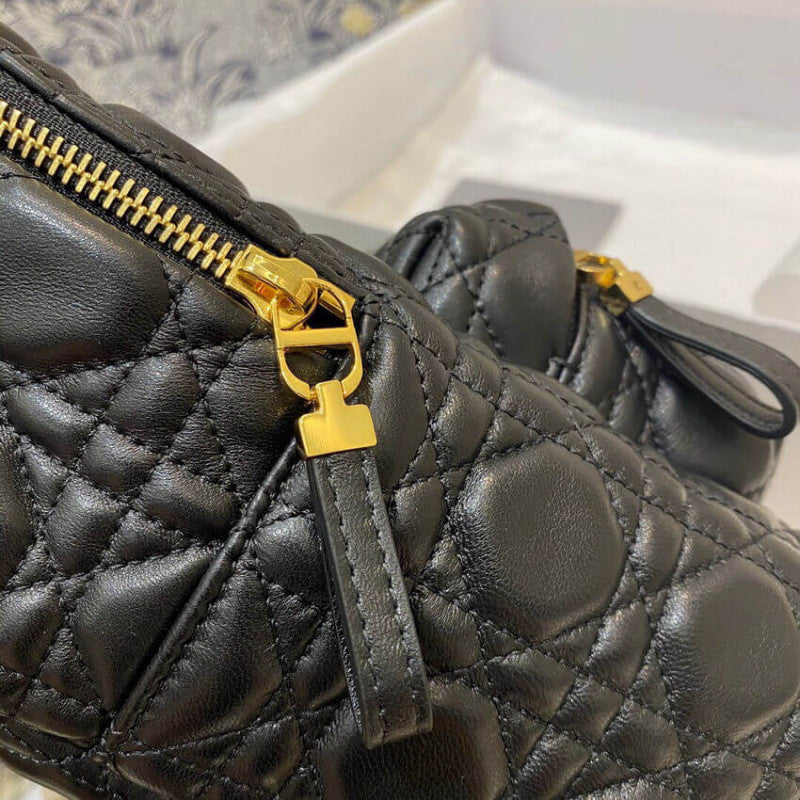 The season's new Backpack combines modernity and the House's timeless elegance. The design is crafted in black lambskin with Cannage stitching and its quilting instantly stands out. The 'CD' signature embellishes the front pocket and zip closures, while an antique gold-finish metal ring is cleverly placed to hook on small leather goods of the collection. The small bag features adjustable padded straps and may be carried by hand, worn over the shoulder or on the back.