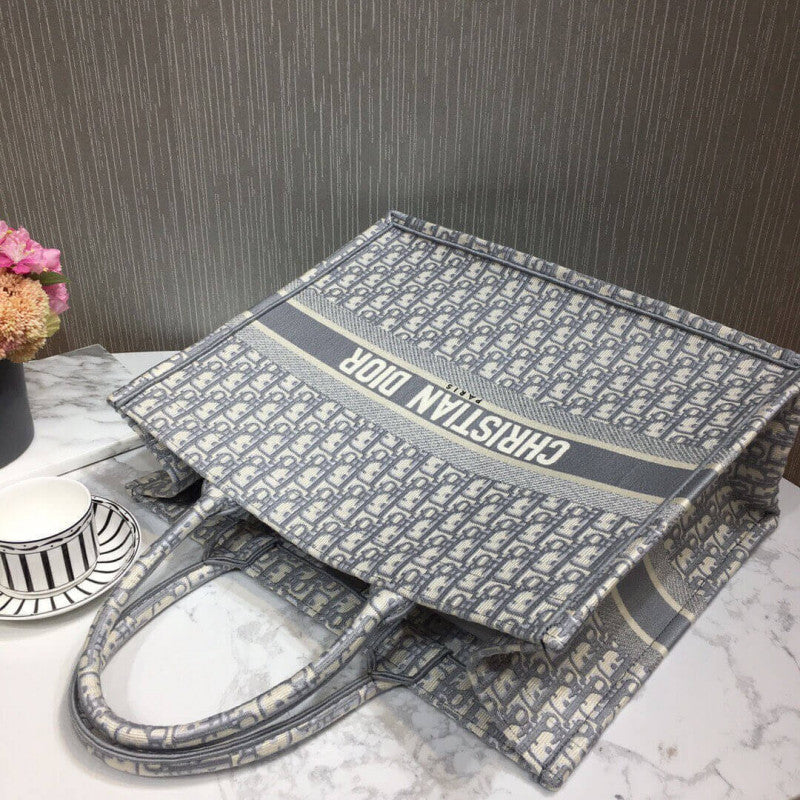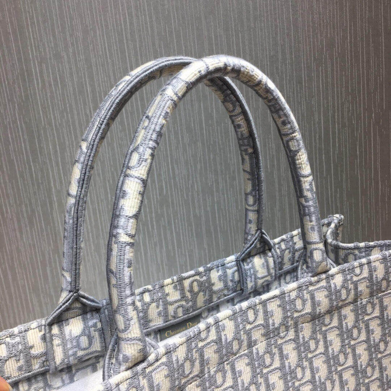 From the 2018 Collection. Navy and creme embroidered Oblique Christian Book tote with dual rolled top handles, embroidered logo at front, tonal canvas interior and open top.