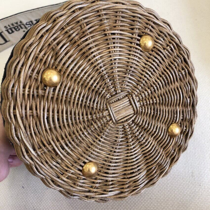 The Wicker bucket bag is a timeless creation traditionally crafted in natural hand-woven wicker and exemplifies 's savoir-faire. The design features a blue Oblique jacquard interior pouch with a patch pocket and diorawstring closure. Inspired by the hallmark Book Tote, it showcases a band embroidered with the 'CHRISTIAN ' signature, while the wide embroidered shoulder strap allows it to be worn over the shoulder or crossbody.
