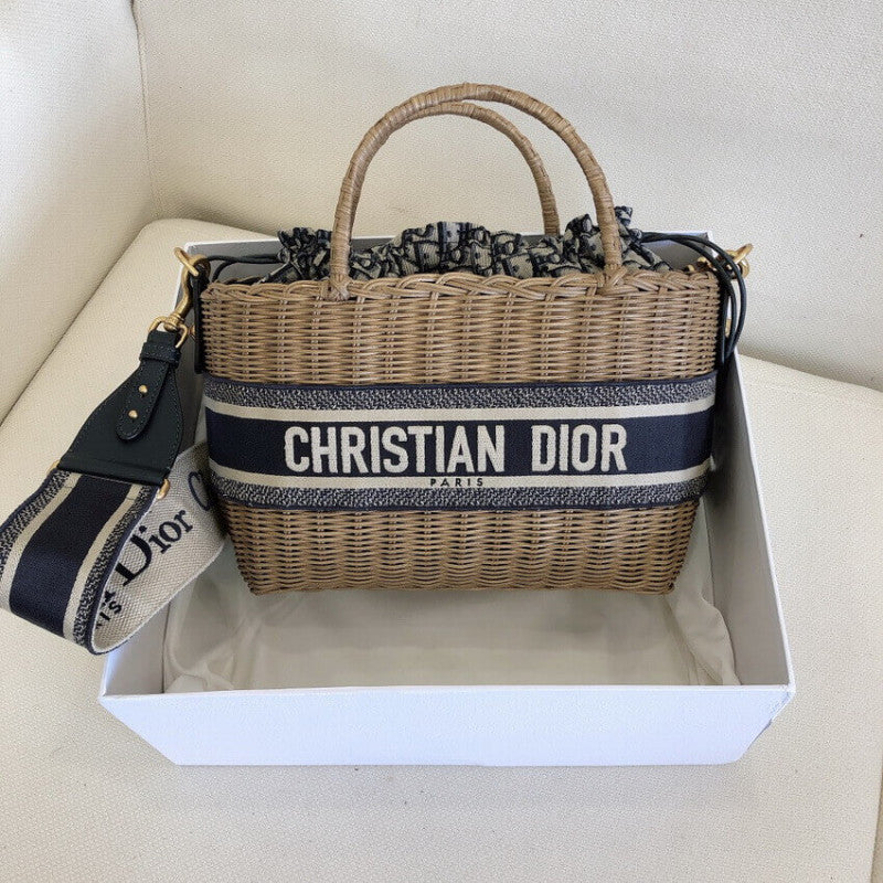 The Wicker basket is a timeless creation traditionally crafted in natural hand-woven wicker and exemplifies 's savoir-faire. The design features a blue Oblique jacquard interior pouch with zipped pocket and a diorawstring closure. Inspired by the hallmark Book Tote, it showcases a band embroidered with the 'CHRISTIAN ' signature, while the wide embroidered shoulder strap allows it to be worn over the shoulder or crossbody.