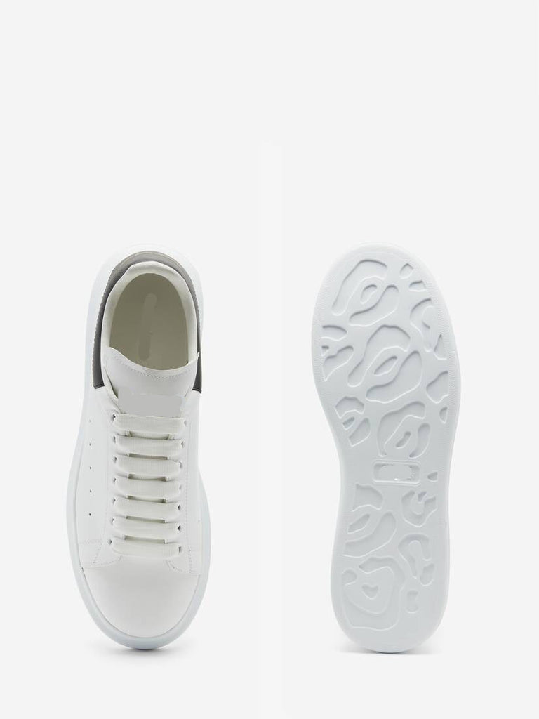 White smooth shiny classic calf leather lace up sneaker with oversized rounded rubber toe and black back details. Perforated air hole detail on sneaker. Kid leather lining and? hole metal eyelets. Flat large laces with on tongue and back counter. Oversized rubber sole.