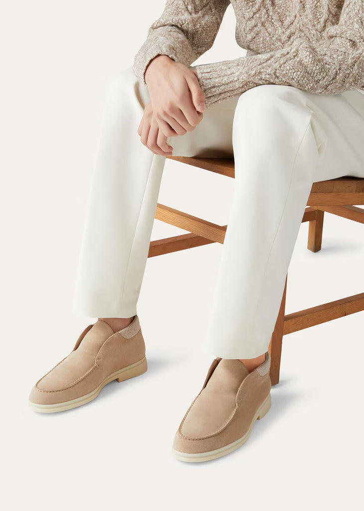Non-slip soles with all-over embossed monogramDedicated space on the heels where you can write your nameFront stitching with hand-threaded wax yarnComposition: 100% SuedeSpecific Features: Lining: 100% Calfskin; Details: 100% Cashmere; Soles: 100% Rubber