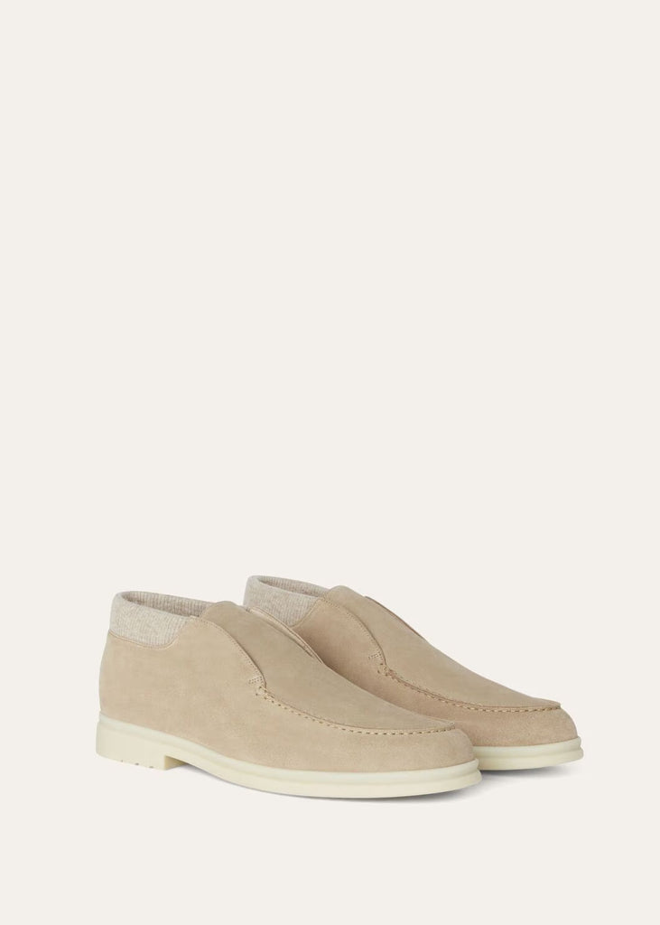 Classic chukka boots made from suede. They are enhanced by leather lining and a patented opening with elastic hidden under the tongue, guaranteeing an extremely comfortable fit. Perfect in casual or formal looks, they feature a lightly padded, ribbed cashmere-knit trim.