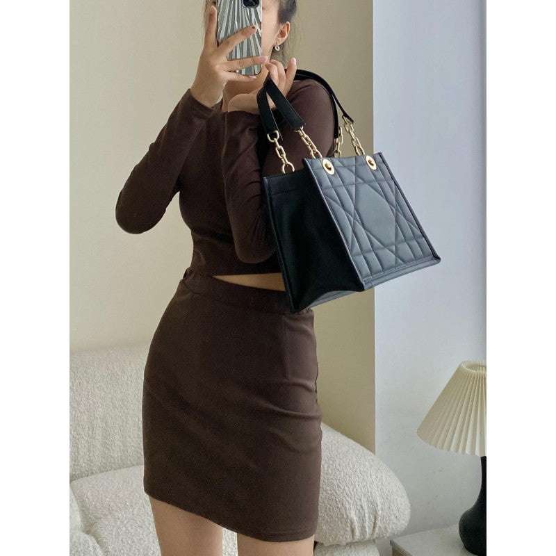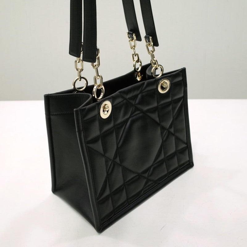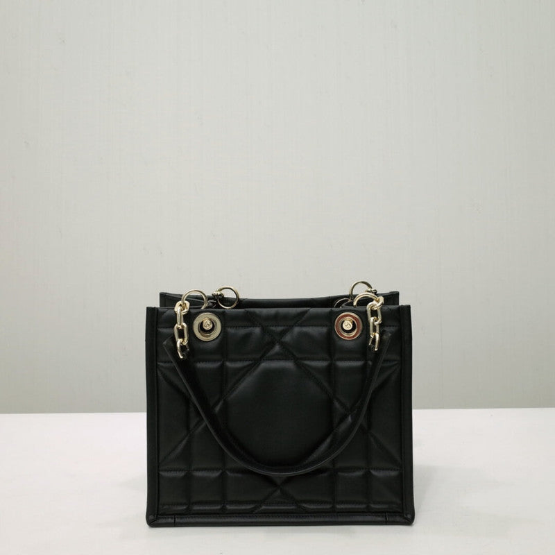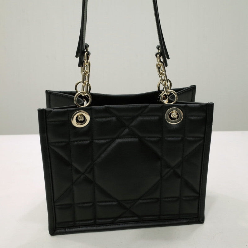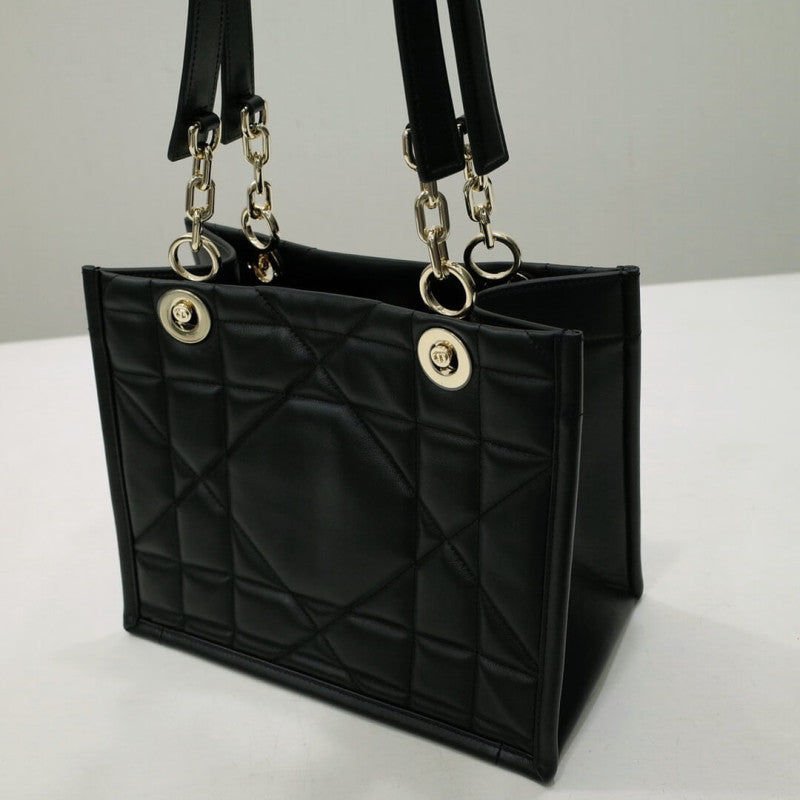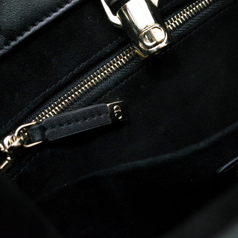 A new House staple debuted at the Fall-Winter 2022-2023 ready-to-wear fashion show, the Essential tote bag presents a functional design with modern elegance. Crafted in black satin-finish calfskin, it is adorned with the Archicannage motif offering a new take on the iconic House topstitching. The spacious interior features three patch pockets and one zipped pocket to accommodate all of the essentials. Featuring leather and pale gold-finish metal chain top handles, the small tote may be worn over the shoulder or carried by hand as an ideal daily companion.
