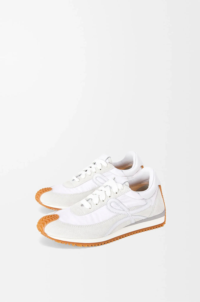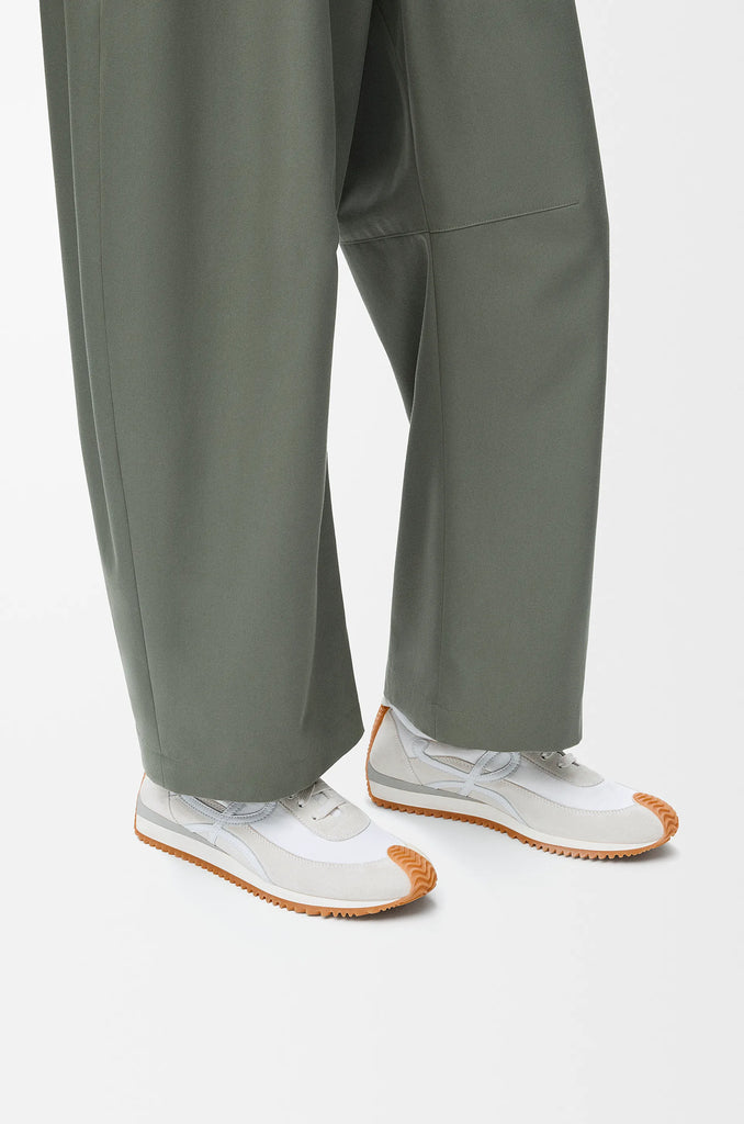Suede and nylon lace-up sneakers with soft upper with L logo and honey-colored rubber wavy sole wrapped to the toes and bent to the heel. SS23 shoe series uses tension and comparison: handicrafts and craftsmanship collide, and natural materials and craftsmanship create sparks. Key details include playful heels, graphic logos and asymmetric toe and laces.